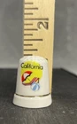 This vintage California thimble features a charming beach scene with an umbrella, chair, and beach ball. It was made in the United States and is crafted from porcelain. The thimble has a nostalgic feel, as it was manufactured in the 1980s, and is considered to be a collectible item. It has a unique design that makes it a great addition to any collection, especially those focusing on vintage items from the 1930s until now. This thimble is perfect for anyone who loves collecting unique items or those who love beach-themed decor. See pictures. Blemish on the front in the word California.
