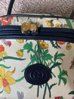 This vintage Gucci Flora crossbody bag from the 1980s features a charming floral print, making it a standout piece for any collection. The medium-sized bag is cylindrical in shape, with a zip closure and a blue leather crossbody strap. With gold hardware accents, this bag is perfect for weddings, parties, casual outings, or formal events. The multicolor exterior is crafted from canvas and leather, with a vinyl lining in a coordinating blue shade. With inner pockets and a zip-around feature, this handmade Gucci bag is a stylish and functional addition for any fashion-forward woman.