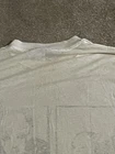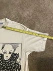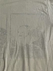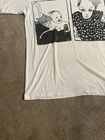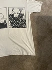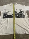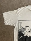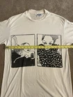 Vintage 1980s graphic T-shirt printed on a Hanes Fifty-Fifty blank. This shirt features a two-panel black ink graphic rendered in a stark underground comix / zine art style. The imagery depicts surreal, unsettling figures with exaggerated anatomy and repeated star and crescent moon motifs, presented in boxed comic-style panels. There is no text, logo, band name, or copyright printed on the garment. Research & Attribution Notes I have spent time researching this piece and comparing it to documented underground art and merch from the 1980s punk / post-punk / comix scene. Based on the visual style, print execution, blank used, and lack of commercial branding, this shirt appears consistent with small-batch underground art merch rather than mass-market band merchandise. The artwork shows strong stylistic similarities to artists associated with the 1980s underground comix movement, particularly the visual language seen in the work of Gary Panter and artists from the same era and circles (RAW Magazine, Slash Magazine, and similar underground publications). This includes the heavy hand-drawn line work, psychologically charged figures, and surreal, confrontational tone. There is no printed artist credit, and I have not found an exact published match for these specific images. Because of that, no definitive artist attribution is claimed. The above reflects my personal research and informed opinion based on known underground art aesthetics from the period. Details • Brand: Hanes Fifty-Fifty • Era: 1980s (based on tag style and Made in USA construction) • Material: 50% Cotton / 50% Polyester • Made in USA • Size: Large (42–44 on tag) • Color: Tan with black graphic • Print: Front graphic only • Care tag present Condition Vintage condition consistent with age. Light wear and print softness expected for an item of this era. No major structural damage observed. There is one tiny hole that I can see please see photos. Please review all photos carefully for exact condition. Summary This is an authentic vintage 1980s underground art graphic T-shirt on a period-correct Hanes blank. It is offered as an original piece of underground art merchandise, with research-based context provided above and no unverified claims of authorship. This item is preowned. Nice condition for age. This shirt is very thin and it’s material. Please see photos for condition. This item is sold as is.