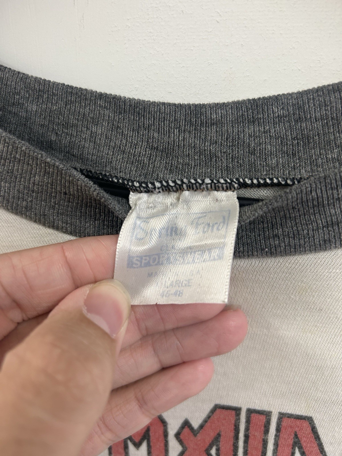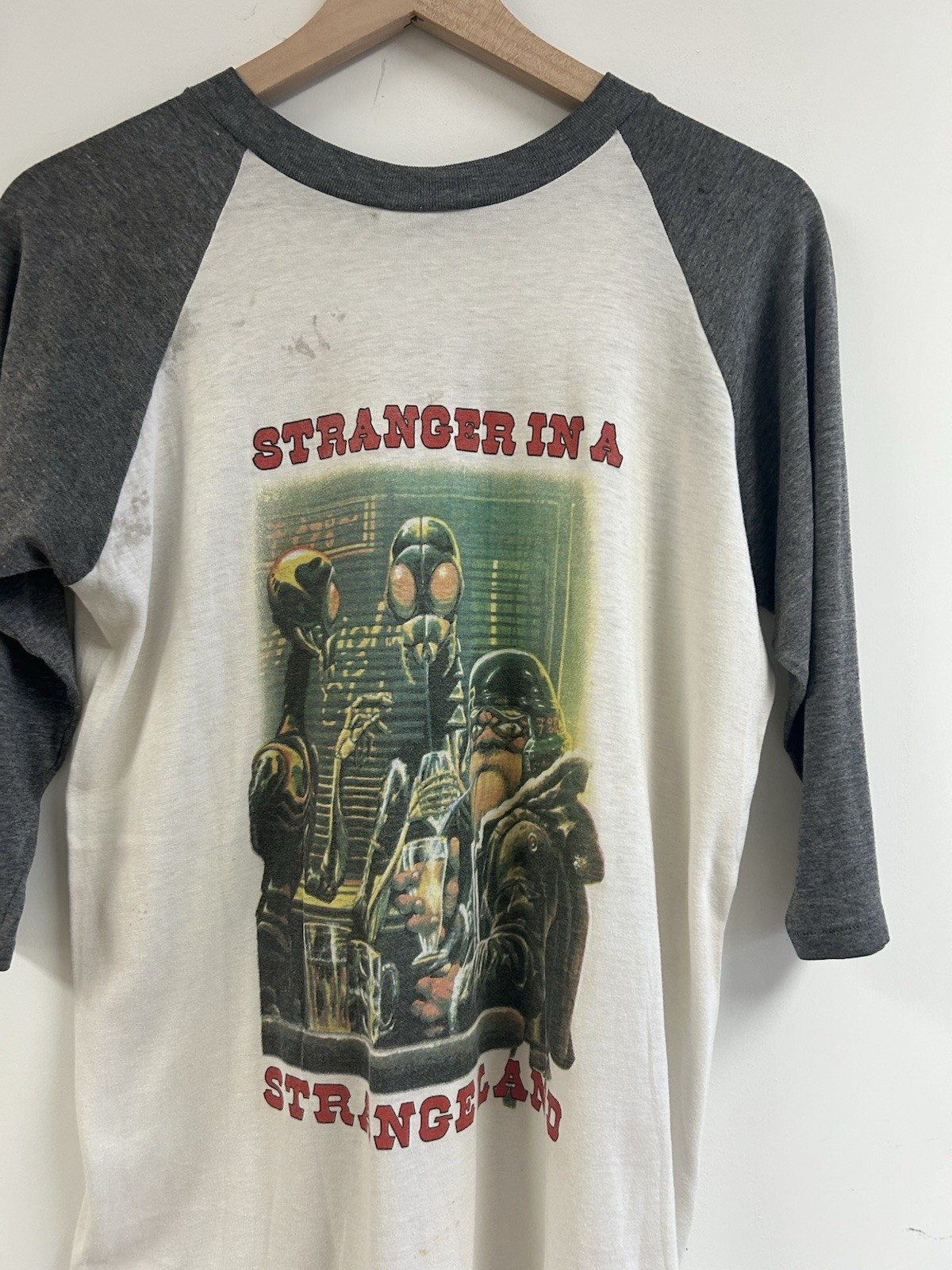 Vintage 1987 Iron Maiden “Make My Day” Stranger in a strange Land Raglan T shirt Tagged Size XL on Spring Ford tag 50/50 21x28 Some staining and signs of wear throughout. Please see photos for representation.