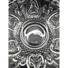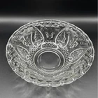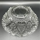 KIG Malaysia Covered Glass Nut & Candy Bowl Hearts Roses Fleur De Lis Crosshatch Beautiful pressed glass covered candy dish from KIG Indonesia and Malaysia It is decorated with pressed imprints of hearts with roses inside - fleur de lis patterns and crosshatch design around the top and bottom Item weight: 1 lb 9.8 oz (before packaging) Diameter: 7” Height: 4”