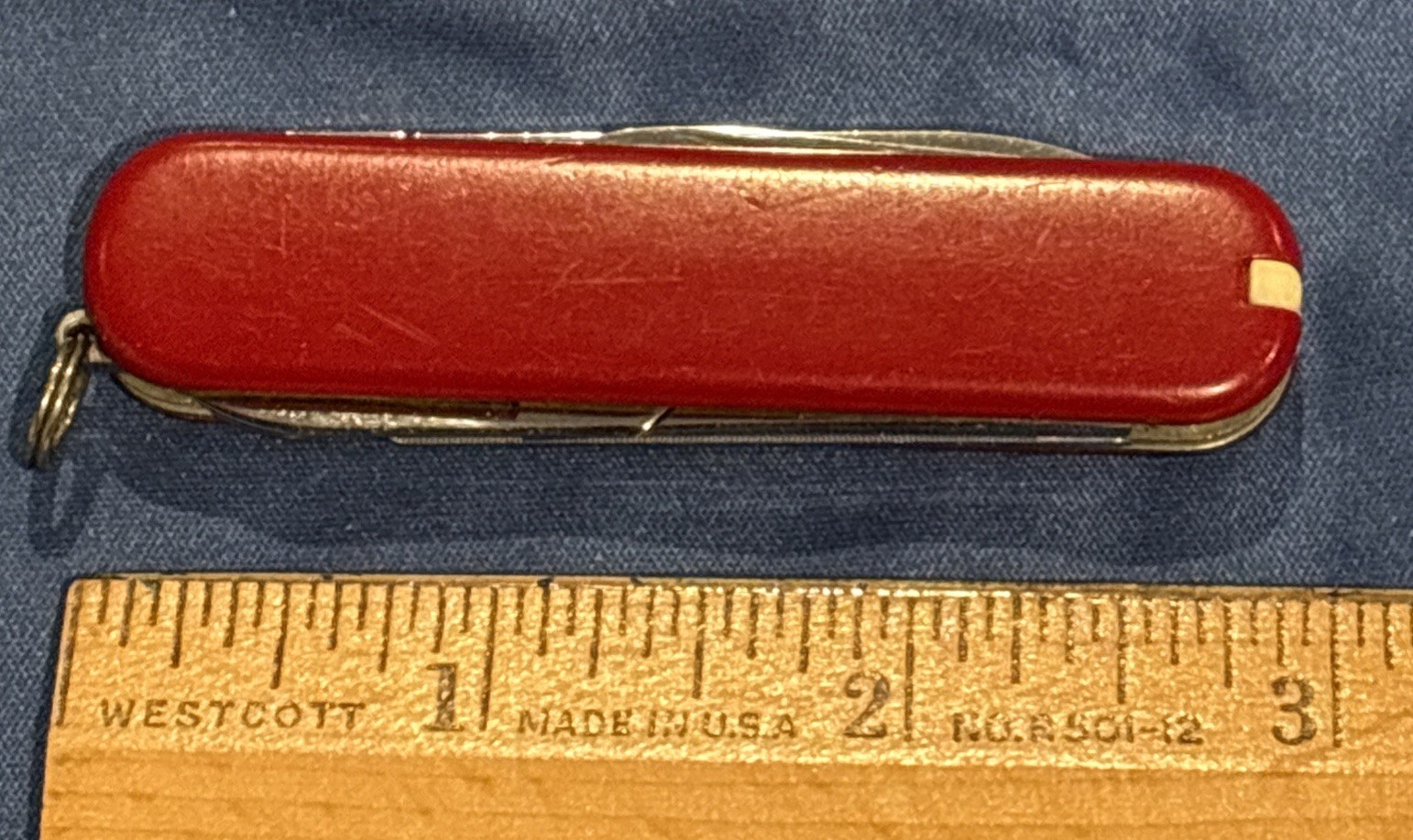 Vintage 1980s Victorinox Executive Swiss Army Knife 74mm Highly Collectible! Great condition! Vintage Victorinox Swiss Army Knife – Executive model, measuring approximately 74 mm (about 3 inches) closed. Manufactured in the late 1980s based on tang stamp. Tools included: • Main blade • Secondary blade • Nail file with nail cleaner • Scissors • Serrated orange peeler / scraper with flathead screwdriver tip • Tweezers and toothpick Keychain ring Knife is in very good vintage condition. Red Cellidor scales are intact with no cracks. Tweezers and toothpick are present. A classic Swiss Army Knife for EDC and a very desirable piece for collectors! Great find!
