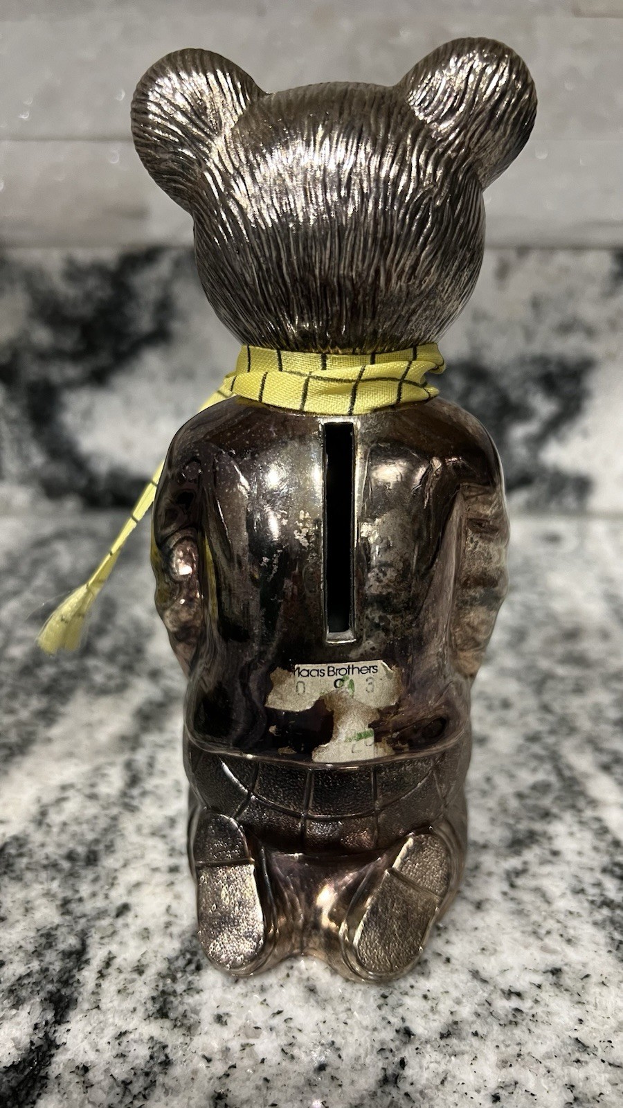 Vintage 1982 Express Newspapers Limited silverplated teddy bear coin bank, made in Japan. Marked on bottom: • Express Newspapers Limited 1982 • NR Silverplated Japan Silver-plated finish with coin slot on back. Condition: Pre-owned vintage condition with light tarnish and surface wear from age. Bottom coin plug/cap is missing (see photos). Great collectible 1980s bear bank for display, nursery decor, or silverplate collectors.