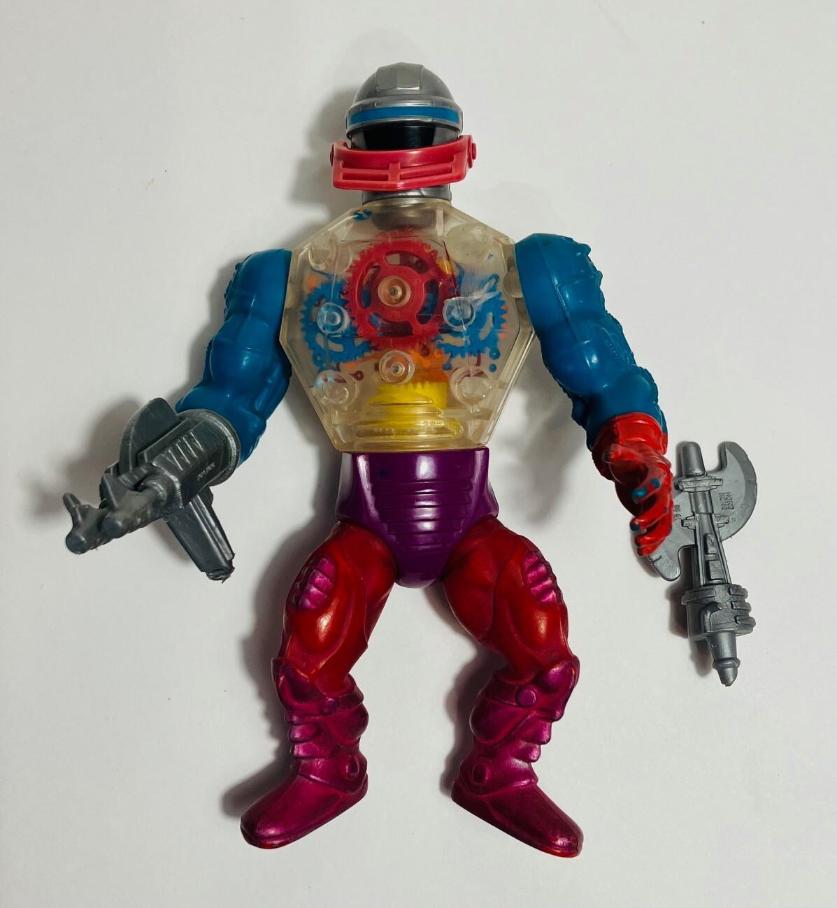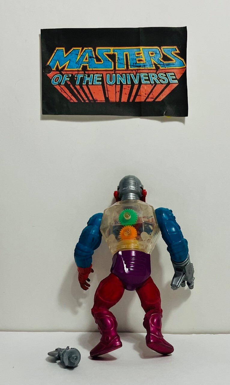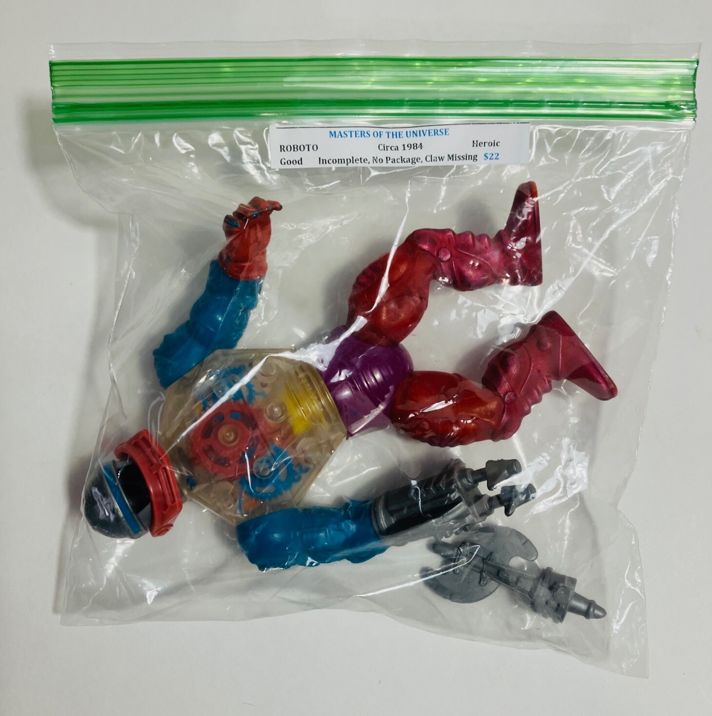 Shipping is free for this vintage 1984 Masters of the Universe "Roboto" action figure by Mattel. This figure is in good condition and has its attached weapons included. There is no original package and the claw attachment is missing. The plastic figure stands at 5.5 inches tall and is part of the "Heroic" Universe series. "Roboto" is a must-have for any MOTU series collector.