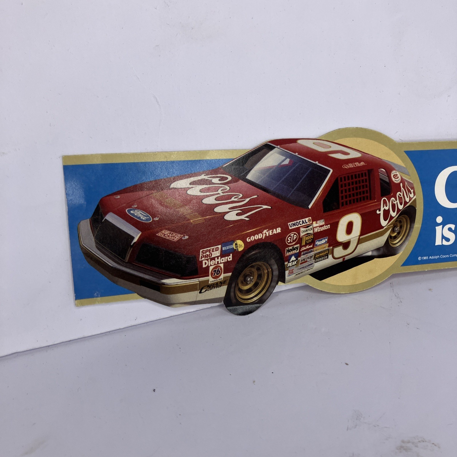 The product is an original 1985 Bill Elliot #9 Coors is the one bumper sticker decal measuring 10 inches in size. This decal is a piece of fan apparel and souvenir associated with NASCAR auto racing, specifically featuring Bill Elliot and Coors beer. It serves as a collectible item for fans of the sport and the driver. This decal is a nostalgic piece that would appeal to fans of vintage racing memorabilia.