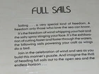 Vintage Factory Sealed Puzzle "Full Sails" No.15-455-90 Over 500 Pieces Finished Size: 18" x 24" Made in U.S.A.©1985 Sheaffer Eaton, Textron Inc. Pictures are of the actual puzzle you will receive. Will be shipped in a box. Package weighs over 2 pounds.