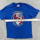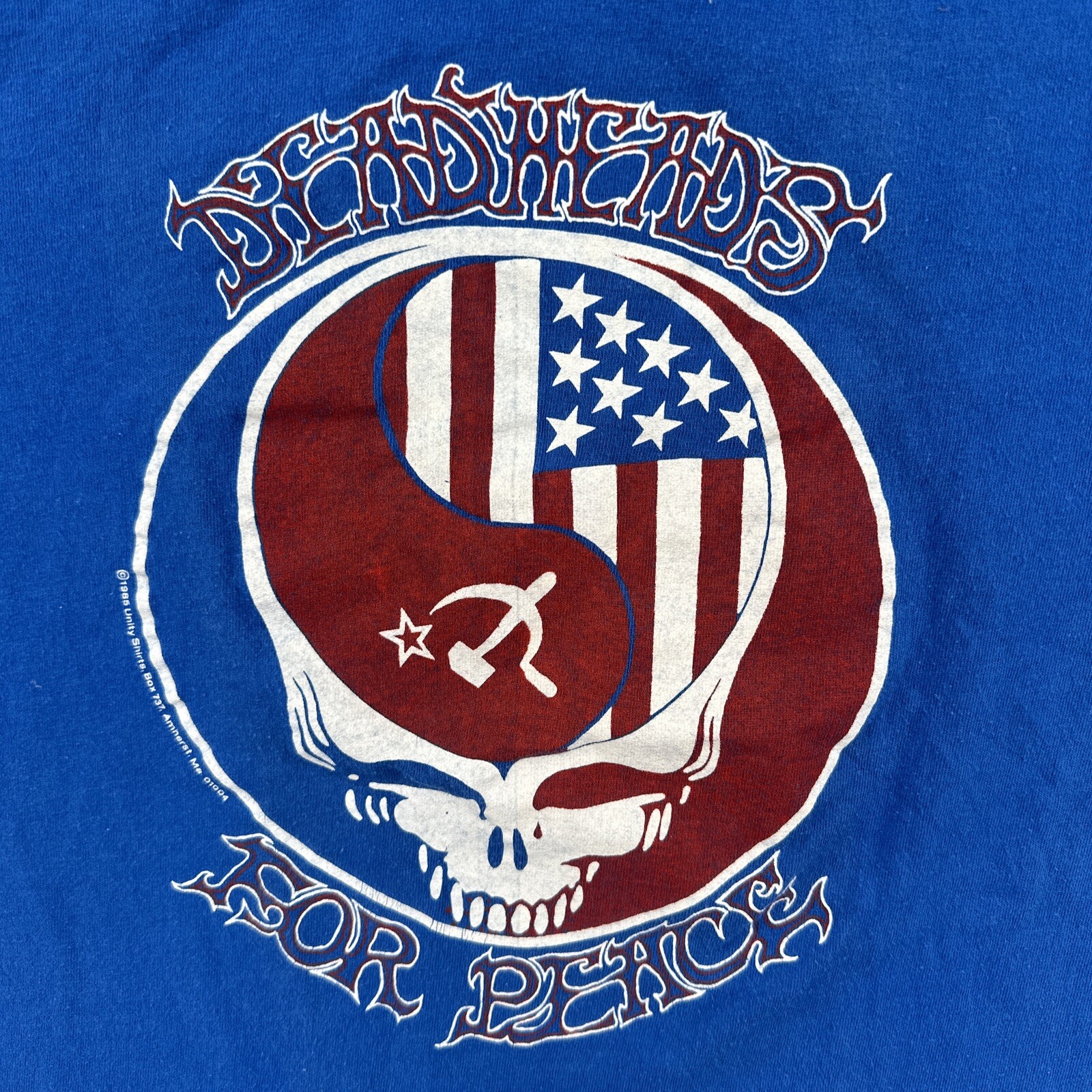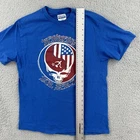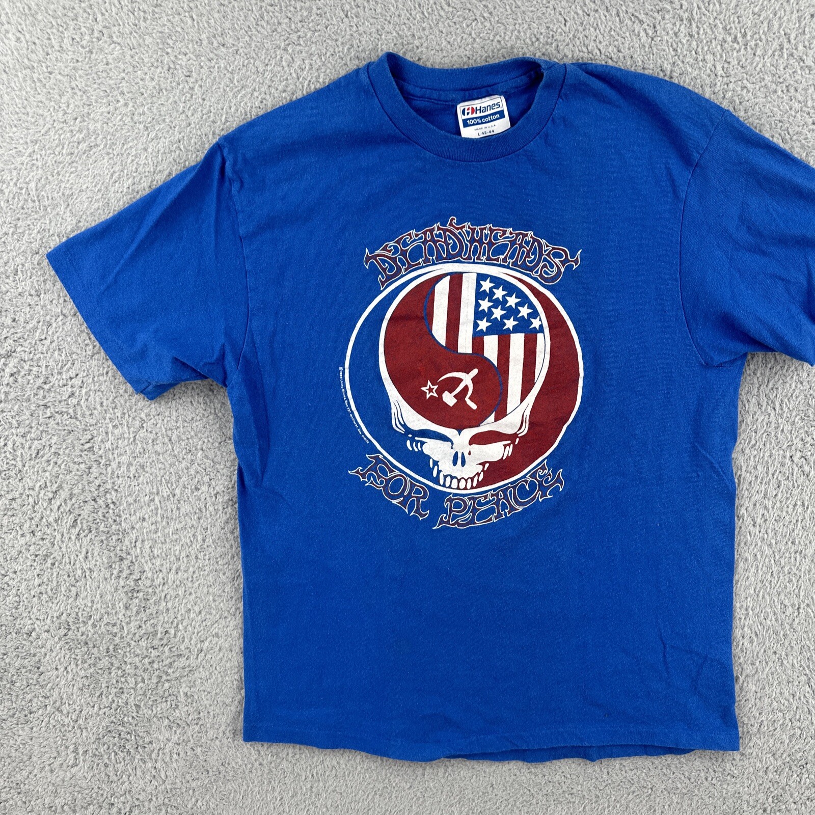 This vintage Hanes T-shirt in size L features a solid blue color with a crew neck and short sleeves. It is adorned with a stitch design and has a Grateful Dead Deadheads For Peace Russia Concert 1986 theme. Made of cotton knit fabric, this classic tee showcases a hipster, USA, rock, hippie, and music-inspired style, perfect for all seasons. No holes or stains See pictures for pictured measurements compare with your favorite garment and ask questions if you have any Add to your collection today Browse my other items I can combine shipping