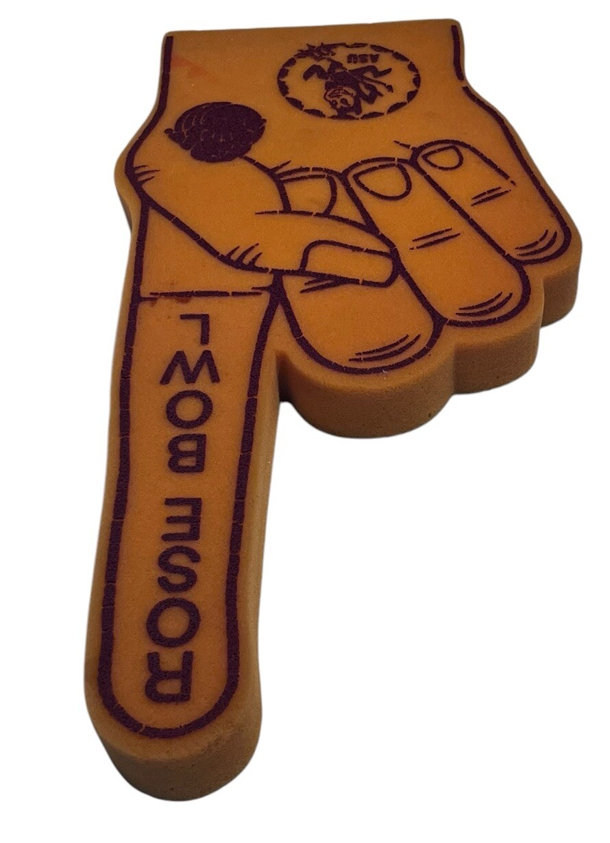 Vintage Rose Bowl Foam Finger Michigan Arizona State 1987 23” Pasadena Football. Good preowned condition showing low normal signs of wear/use. The farm is showing some light peeling/flaking simply from age. Very cool collectors piece. Represents the Michigan Wolverines on one side and the Arizona State Sun Devils on the other side. It is approximately 23“ x 10“. Please see photos for design and condition details. Don’t hesitate to message me with any questions.