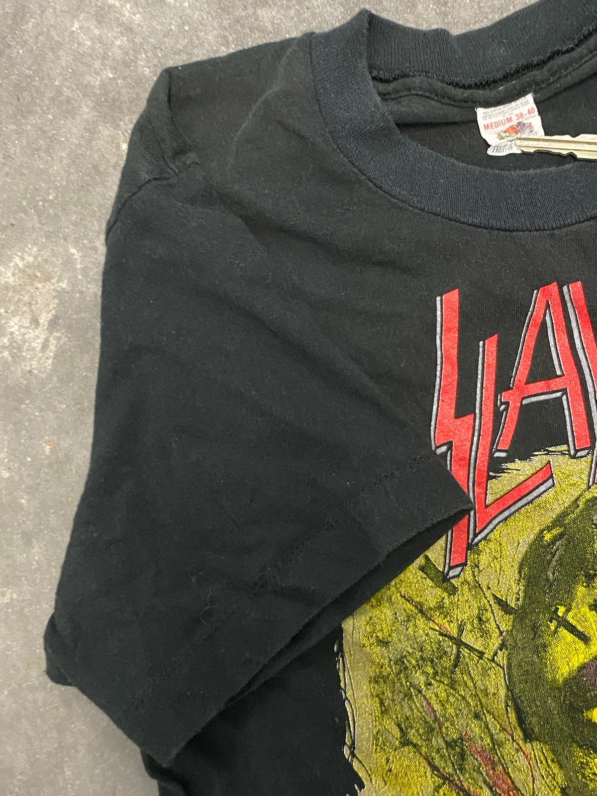 Department:UnisexFit:ClassicCharacter Family:MetalGarment Care:Machine WashableSize:MBrand:Fruit of the LoomStyle:Basic TeeSleeve Length:Short SleeveHandmade:NoFeatures:All Seasons, Double-Sided, BreathableCharacter:SlayerFabric Type:CottonSize Type:RegularModel:Fruit Of The LoomSeason:Spring, Winter, Fall, SummerMaterial:100% CottonPersonalize:NoColor:BlackCountry of Origin:United StatesType:T-ShirtNeckline:Crew NeckVintage:YesAccents:LogoYear Manufactured:1990-1999Theme:90s, SlayerPattern:Graphic PrintProduct Line:Fruit Of The Loom