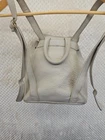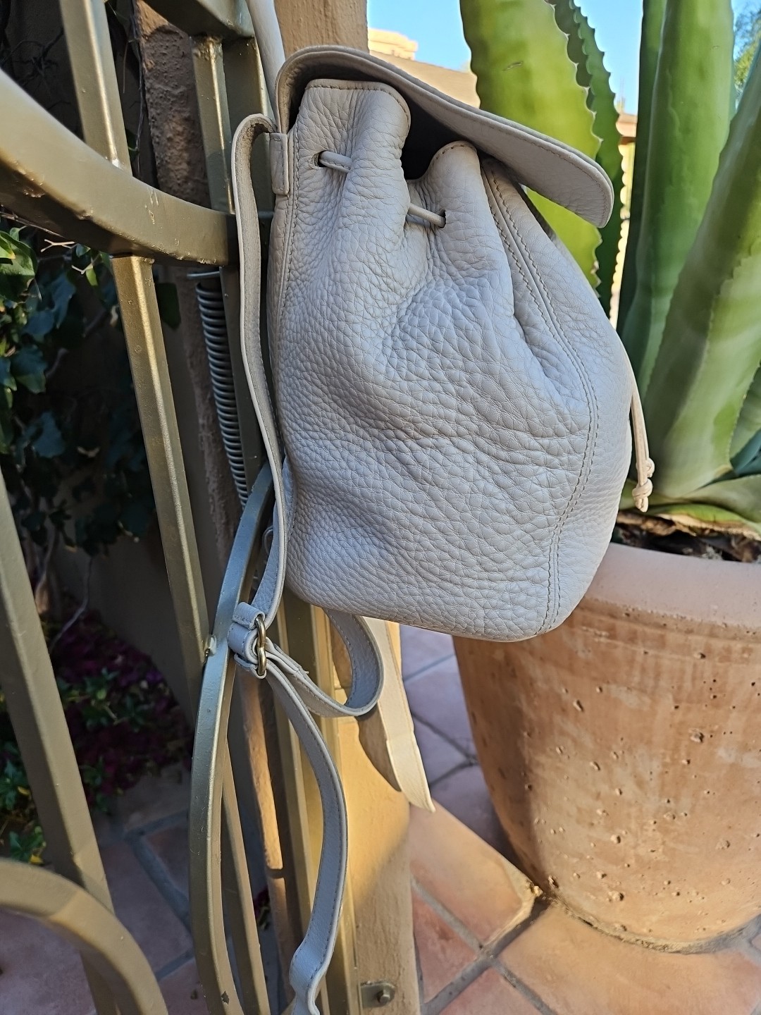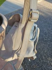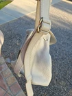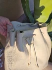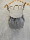 The Coach VTG Natural Pebbled Leather Backpack is a rare vintage find from the 1990s, featuring a unique ivory exterior with a pebbled finish and gold hardware. This large rectangle-shaped bag has a drawstring closure, adjustable ivory straps, and interior zip pocket. Made of high-quality leather with a black fabric lining, this backpack is perfect for travel and casual occasions, showcasing the timeless style and craftsmanship of Coach....#1240