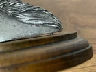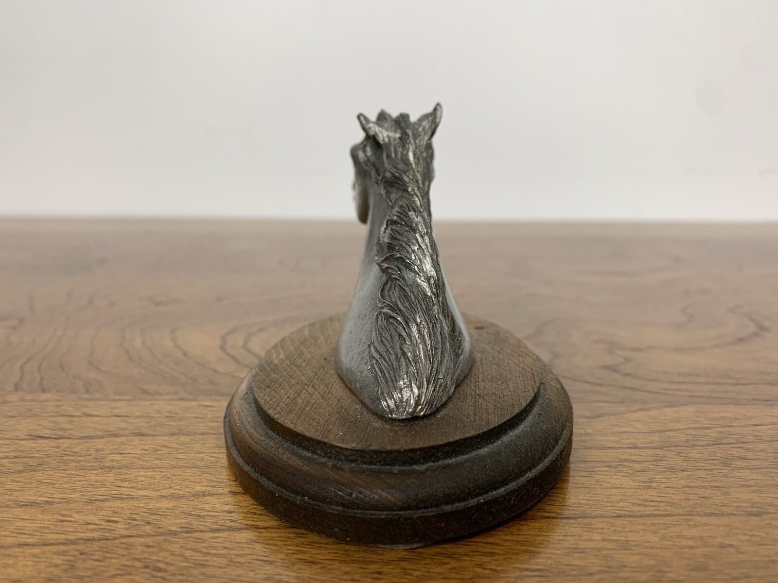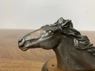 A beautifully crafted pewter horse head on a piece of wood. This figurine is small and simple yet the details in the pewter are lovely. It is in good condition and shows wear consistent with its age and use. The nail holding the head to the piece of wood is a little visible as shown in the pictures. Please look carefully at the pictures as they are part of the description. Measurements: - Lenght: 12.5 cm - height: 7.0 cm - width: 7.5 cm - weight: 350 g