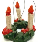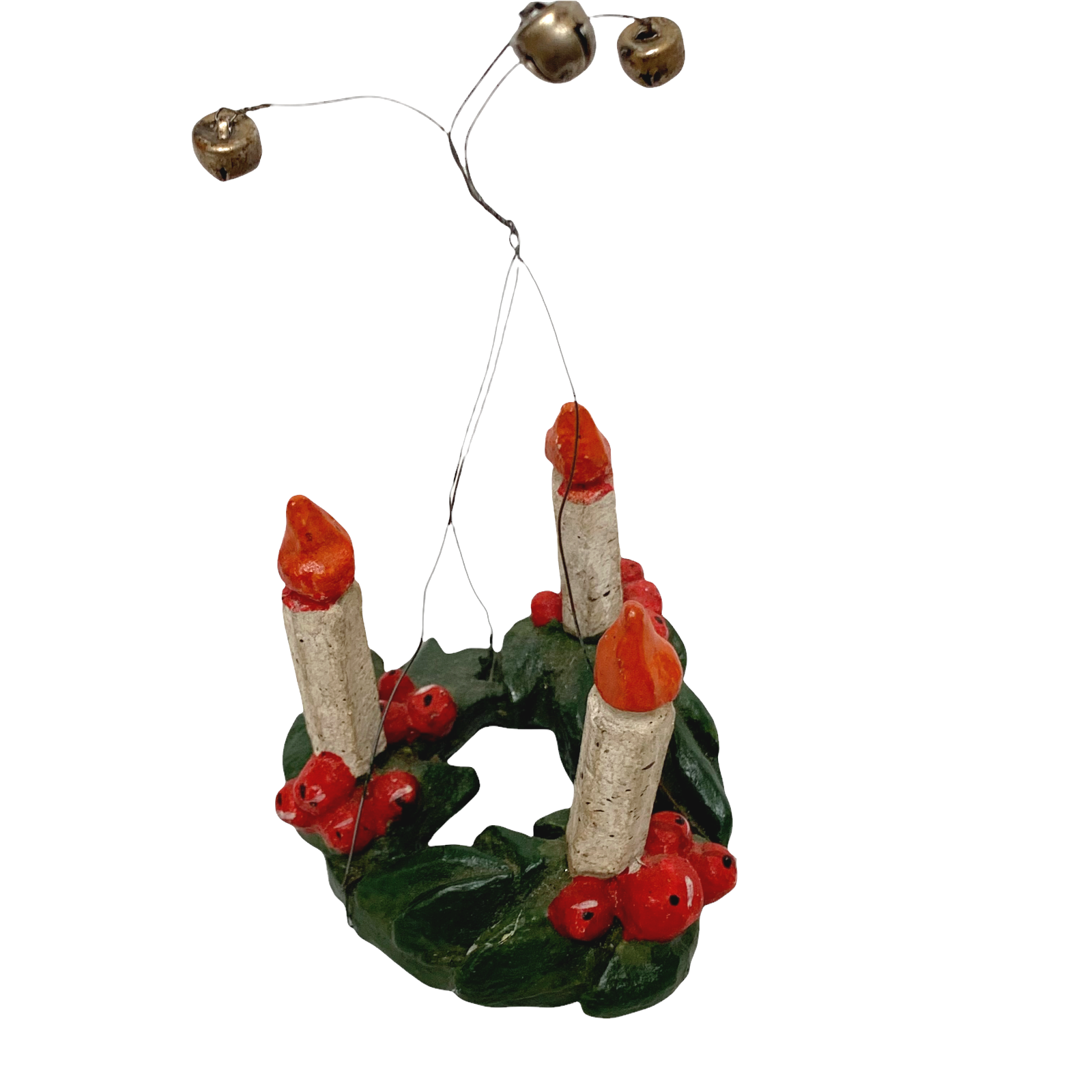 Vintage 1991 House of Hatten DENISE CALLA 3 Candles Wreath Christmas Ornament. This is a vintage 1991 House of Hatten Xmas Ornament. It is 3 candles with wires attaching the bells at the top. Its pretty rare to find this one in complete order. Condition is used. Some wear for something of this age. Please look at the pictures as they are part of the condition. Measures 5" x 3" x 3"