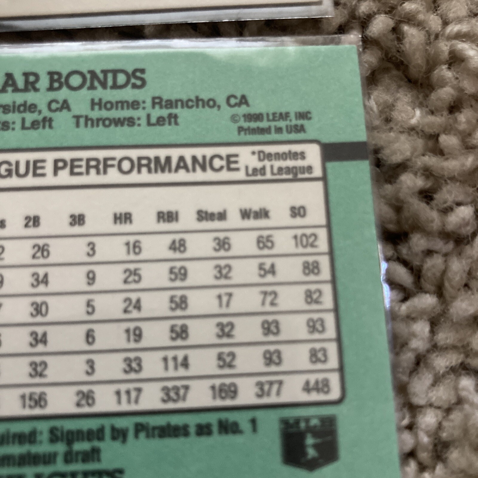 Ken Griffey Jr. & Barry Bonds 5 Card Lot 1991-1993 MLB With 1991 Barry Bonds Donruss DOT/PERIOD AFTER “INC” ERROR CARD. All 5 cards are NM-MT condition. The lot includes: -1991 Score Ken Griffey Jr. #2 -1993 Triple Play Ken Griffey Jr, “JUNIOR” #5 of 10 -1991 Donruss Barry Bonds #495 ERROR CARD- No Period(.) after “1990 Leaf Inc” -1992 Donruss Barry Bonds #243 -1992 Topps Barry Bonds #380 These cards display Ken Griffey J. on the MLB Seattle Mariners while Barry Bonds is shown on the Pittsburgh Pirates. Griffey Jr. went on to also play for the Cincinnati Reds and Chicago White Sox before a farewell tour year back with the Mariners. Barry Bonds played his entire career with the PIttsburgh Pirates & in 1993 spent the final duration of it(career) with the San Francisco Giants.