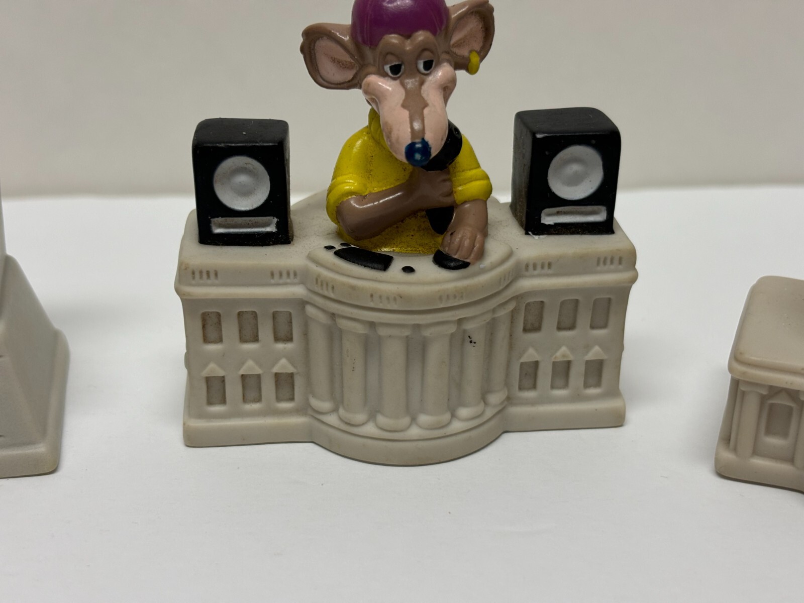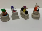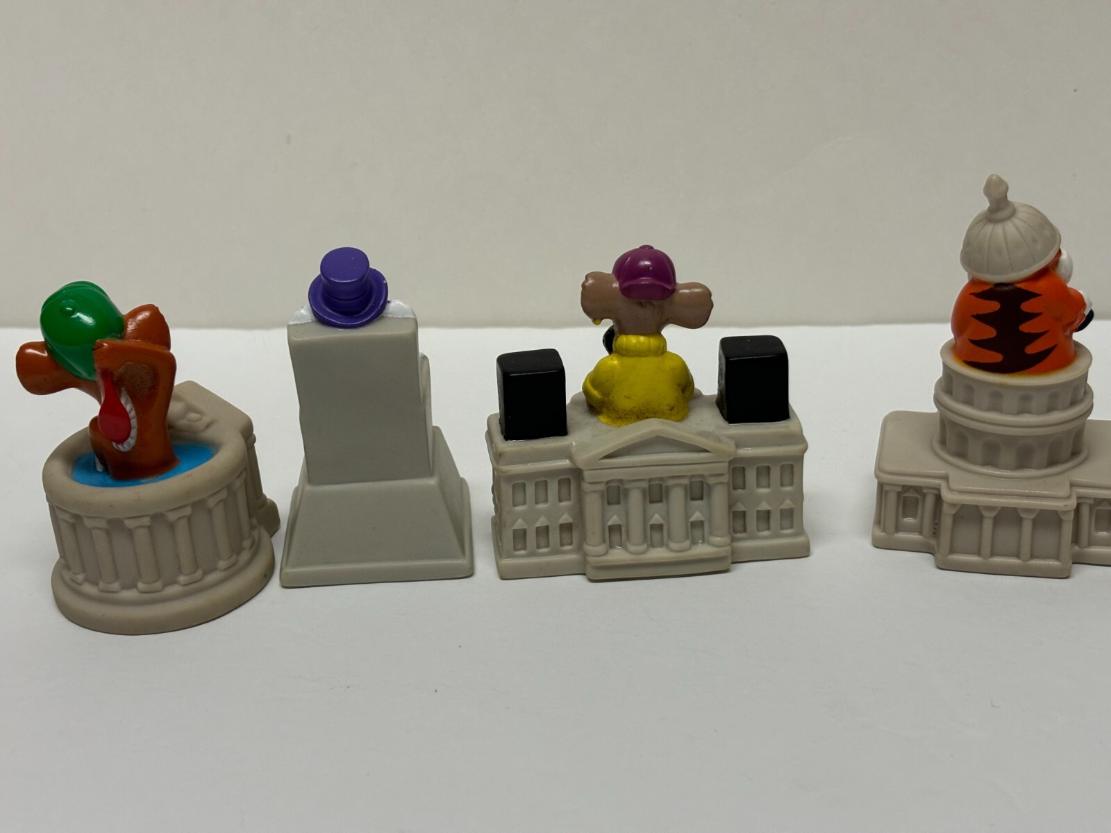 A very timely vintage toy featuring the landmarks of Washington D.C. with a crazy critter on top from Burger King. The landmarks include the Capitol Building, the Lincoln Memorial, The Jefferson Memorial, and the White House. This lot of four vintage 1992 Capitol Critters from Burger King Kids club toys is a must-have for any collector or fan of the beloved character family. Made in China in 1992, these toys are a rare find and a great addition to any collection. Don't miss out on the opportunity to own a piece of Burger King history with this awesome set of Capitol Critters toys.