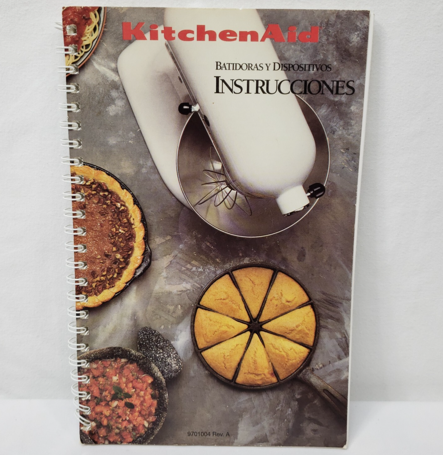 KitchenAid Mixers And Attachments Recipes And Instructions For models K5SS KSM5 K45SS and KSM90 English/Spanish (Spanish instructions are included, recipes are only in English) Spiral bound booklet Used with some wear. Has some writing/notations. Has some marks/spots from kitchen use and storage. Cover has wear including marks, spots, scuffs, and wear around edges and corners. Some pages have marks, spots, or creases.