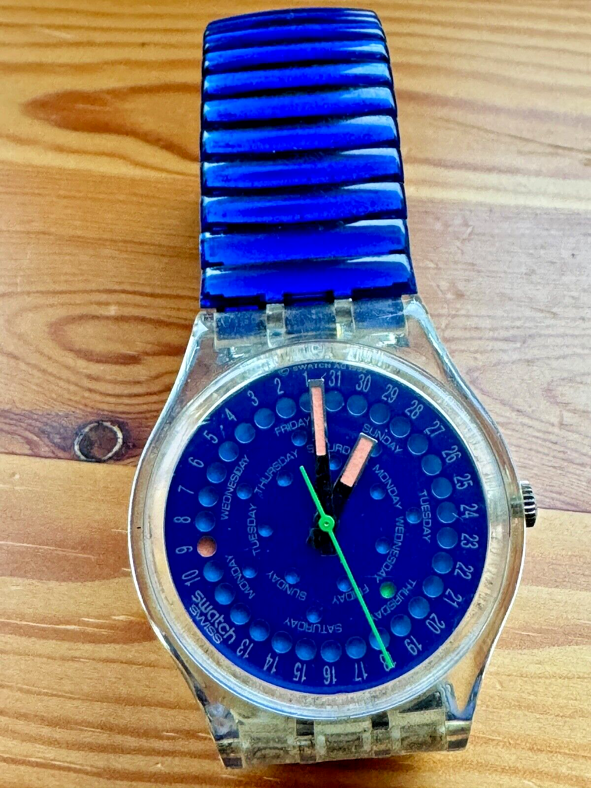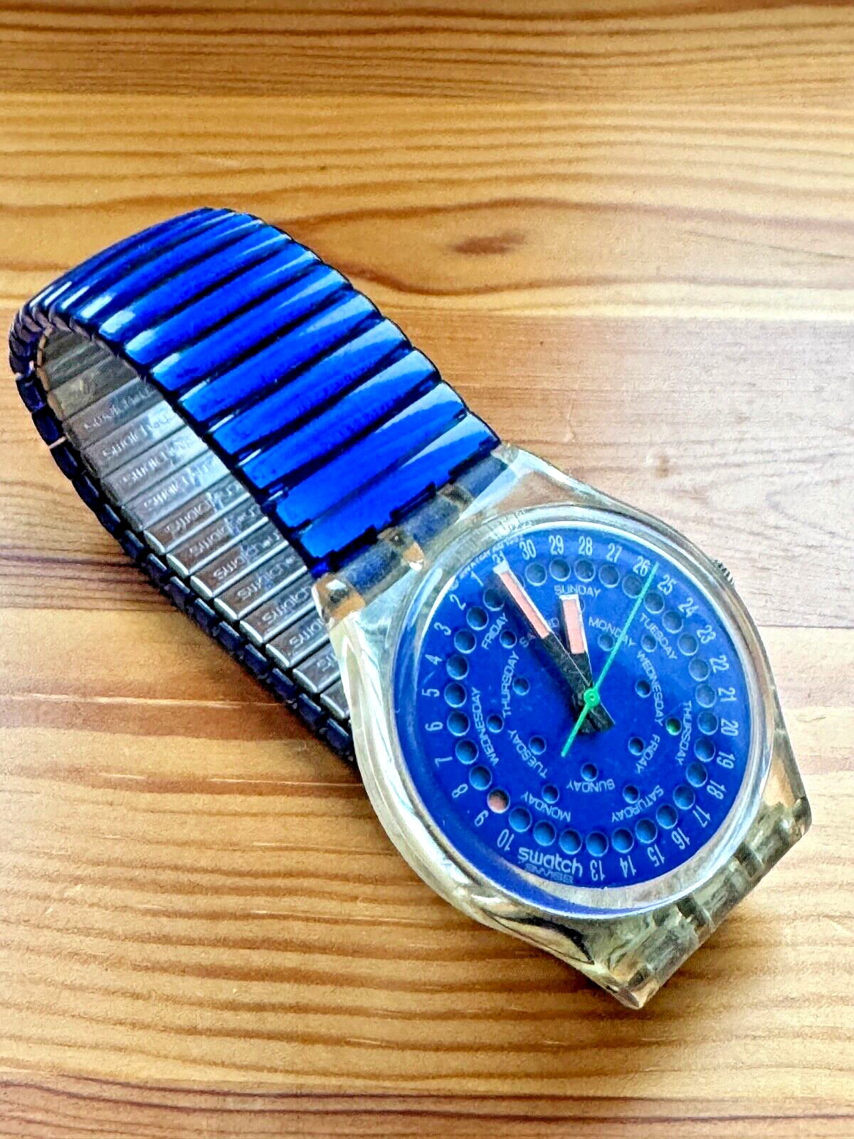 Dial Color: Blue Handmade: No Department: Unisex Adults With Papers: No With Original Box/Packaging: No Display: Analog UPC: Does not apply Reference Number: GK708 Case Material: Plastic Type: Wristwatch Year Manufactured: 1990-1999 Customized: No With Manual/Booklet: No Brand: Swatch Handedness: Left Model: 1992 Swatch GK708 Country/Region of Manufacture: Switzerland With Service Records: No Seller Warranty: No Theme: RETRO Band Color: Blue gtin13: Does not apply Movement: Quartz Case Color: Beige Band Material: Stainless Steel Vintage: Yes Case Size: 34 mm Style: Vintage, RETRO