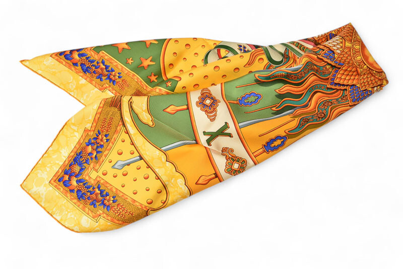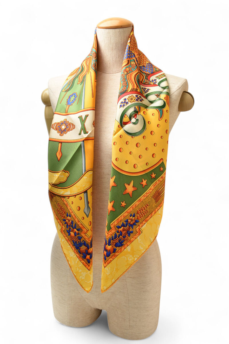 Hermes Authentic scarf vintage Carre 90 silk twill 1994 yellow Description Item No 250510m18 Brand HERMES Item scarf Gender Women Notation Color yellow multi Country of Origin french republic Material silk Size(CM) Charm:W88cm x H88cm Size(Inch) Charm:W34.6 x H34.6inch Accessory only a main part Production features A popular accessory from Hermes, this 100% silk scarf. The high-quality silk feels great to the touch and exudes elegance. It can be used in a variety of ways, such as as an accent for a bag, wrapped around the neck, or as a hair accessory, giving it a wide range of variations. It's also a great gift! Condition Details Rank S ・New, unused. Stored item. - There are folds ・There are no noticeable scratches or stains. ・There is a smell from storage. We recommend that you remove the smell by drying in the shade before use. If you are sensitive to smells or are nervous, please consider carefully.