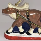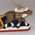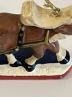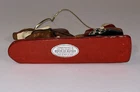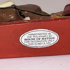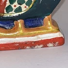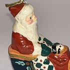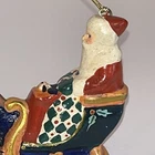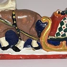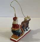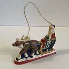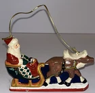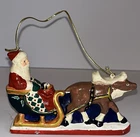 House of Hatten hand painted ornament. Nice size for a shelf sitter or small tabletop addition. Good condition. Some paint wear, particularly on the base. Base looks like wood. Santa/sleigh/reindeer feel like a lightweight composite material. Maybe papier mache?