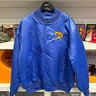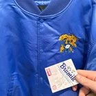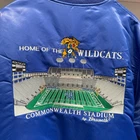 The product is a vintage 1994 Kentucky Wildcats embroidered satin jacket in size large. This unisex adult jacket is colored blue and officially licensed by the NCAA. It features the player DeMarcus Cousins' affiliation with the team, making it a unique item for fans. The jacket is suitable for football enthusiasts and is branded by Brumik, showcasing the team's pride during the regular season of the sport.