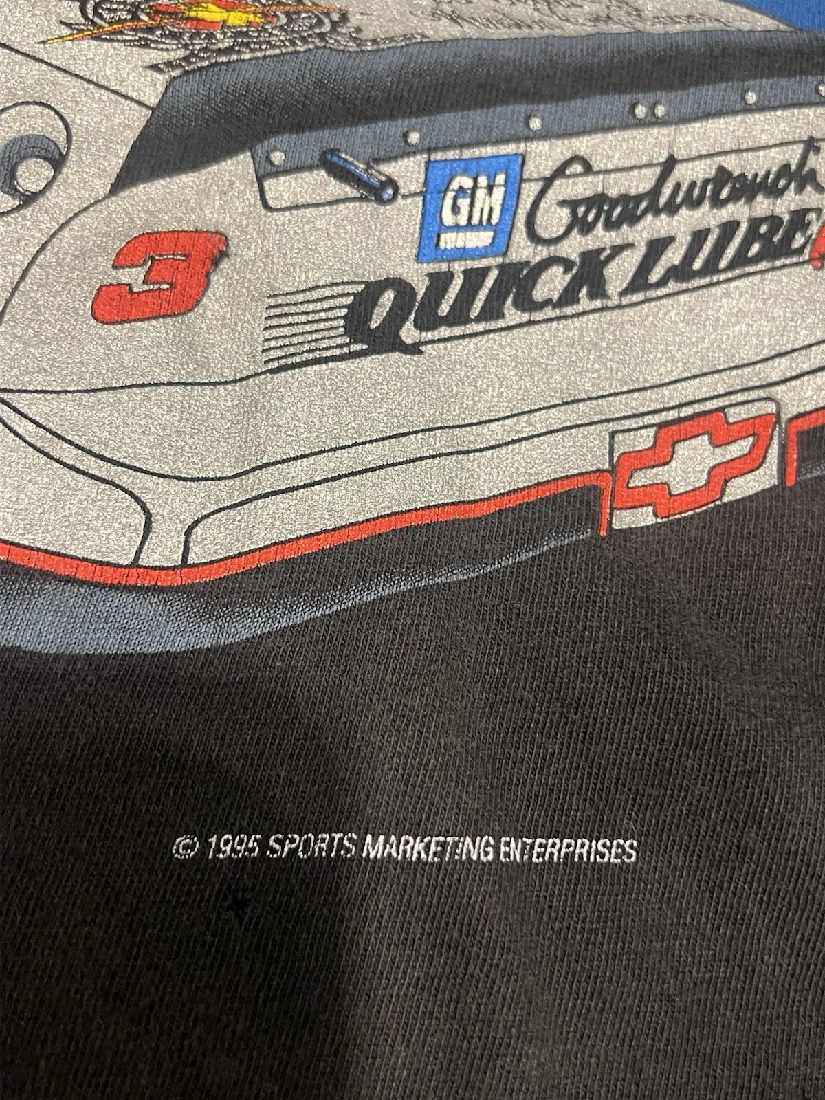 The Vintage 1995 Dale Earnhardt NASCAR One Hot Silver Night Tee is a classic black short sleeve T-shirt featuring the legendary driver's name and image. This retro shirt from the 90s showcases the iconic Nascar theme and is perfect for any sports enthusiast or fan of vintage American style. Made by American Vintage in the United States, this size L tee is a must-have for collectors and those who appreciate the history and legacy of Dale Earnhardt and Nascar racing.