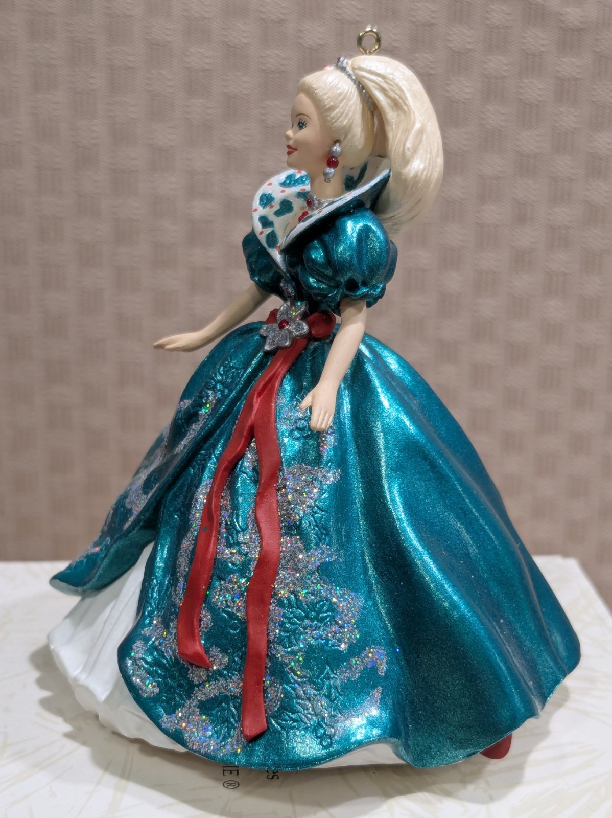 Celebrate the season with the 1995 Hallmark Keepsake Holiday Barbie Ornament, 2nd in the Collector’s Series. Inspired by the beloved 1995 Holiday Barbie doll, she wears a rich red gown with gold accents. A timeless addition to any tree and a must-have for Barbie and ornament collectors alike!