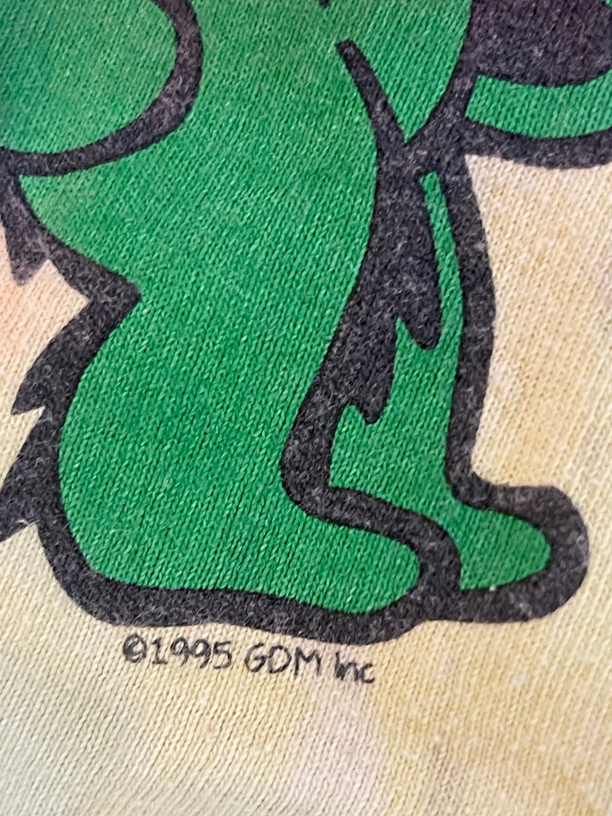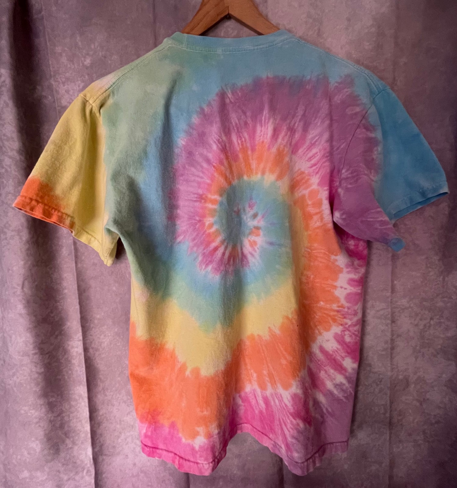 This vintage 1995 Liquid Blue Grateful Dead Spiral Dancing Bears Tie Dye Shirt is a colorful and nostalgic piece of men's clothing. Made from cotton, this short-sleeve shirt features a graphic print of dancing bears, perfect for fans of the Grateful Dead and 90s hippiie culture. With a regular fit and size M, it is machine washable and suitable for the seasons of summer, fall, and spring. This shirt is a unique addition to any wardrobe, showcasing the brand's iconic style and a fun, groovy theme. Top to bottom 25” Pit to pit 20” Shoulder to Shoulder 18” Sleeve length 6 3/4”