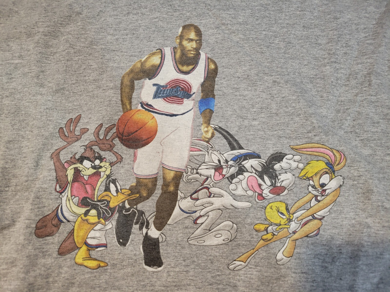 Vintage 1995 Space Jam Movie Long Hoodie Shirt. Large graphic on ches of Michael Jordan, Bugs Bunny, and the rest of the crew. Made in the USA. Size XL, measures approx 22 1/2" chest x 28" length. Sleeves are approx 18" long. Please use measurements provided for approximate size.