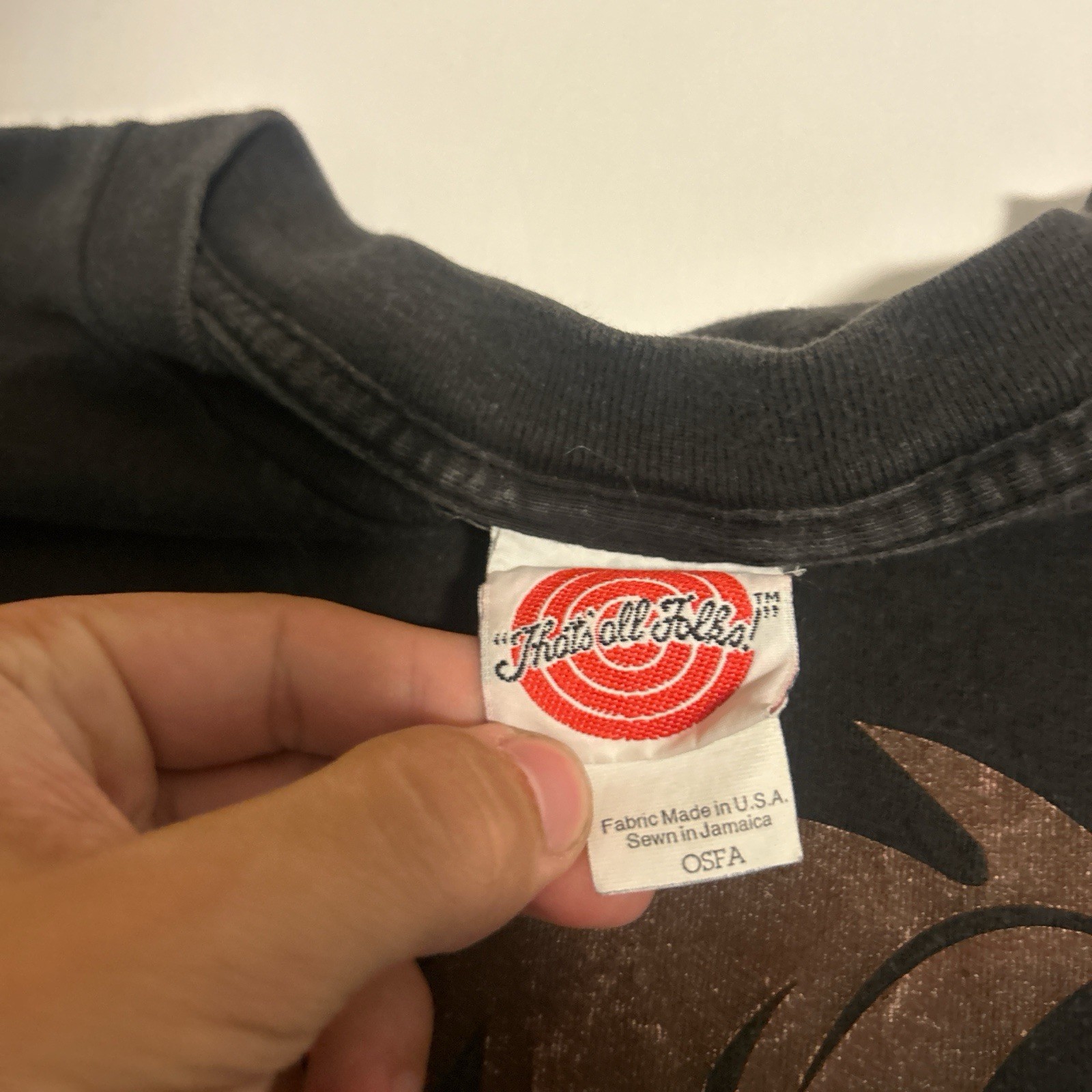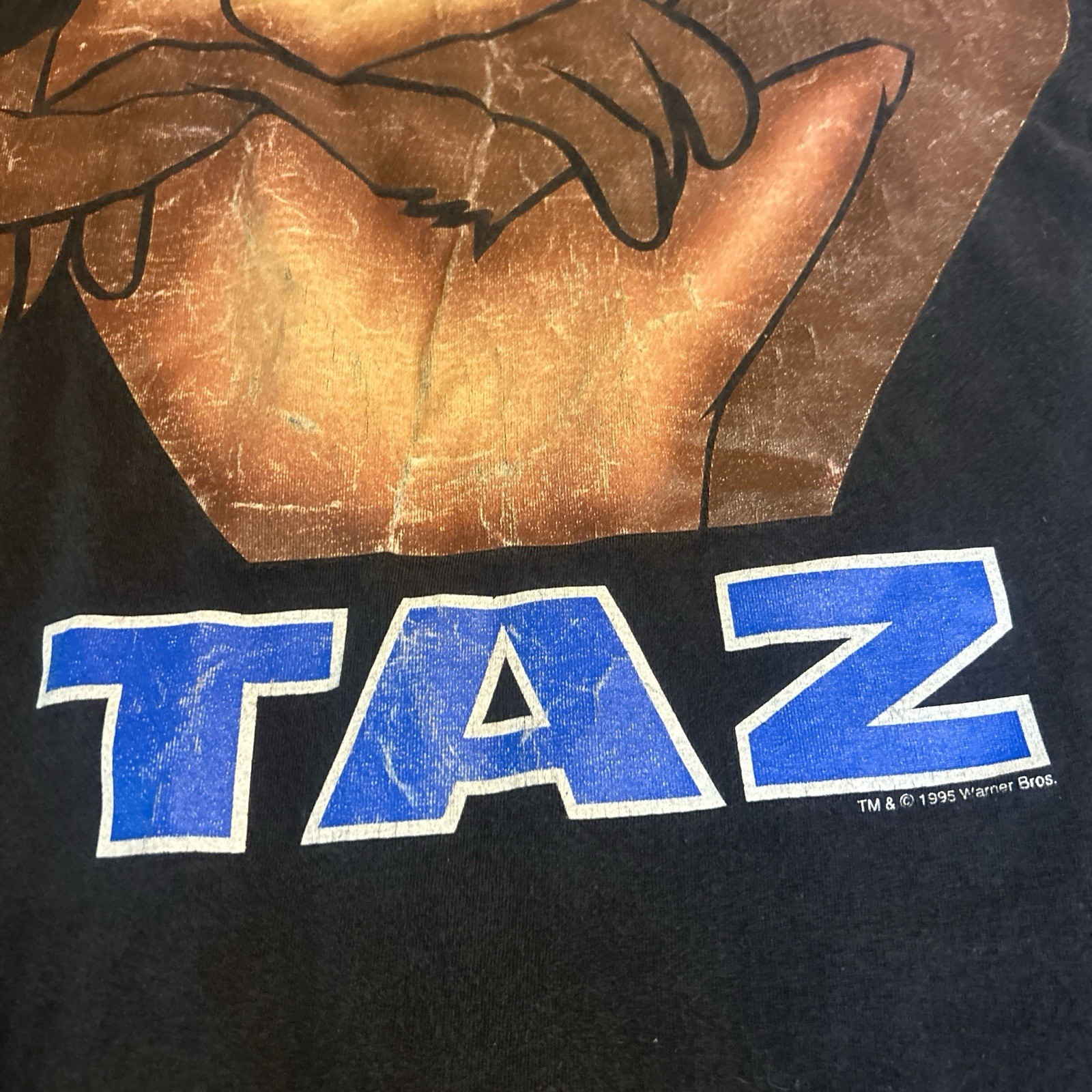 The product is a vintage 1995 Warner Bros Looney Tunes Taz T-shirt in size 2XLT (Short S fits 3XL). This black shirt features the character Taz from the Looney Tunes series and has a crew neck design with short sleeves. It is a regular fit shirt for men, perfect for fans of the animated classic.