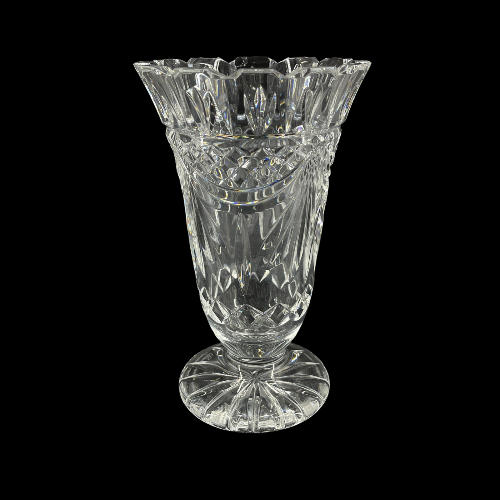 Vintage Waterford Crystal 1995 WS Waterford Society Footed Penrose Flower Vase Gorgeous WS Waterford Society vase with castle cut top rim. Acid etched on base. 8 1/2" tall and 5" diameter at top rim.