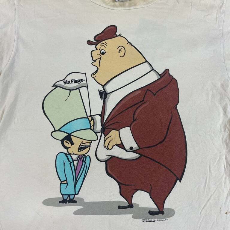 White vintage 1996 Six Flags Theme Park Rocky and Mugsy cartoon tee