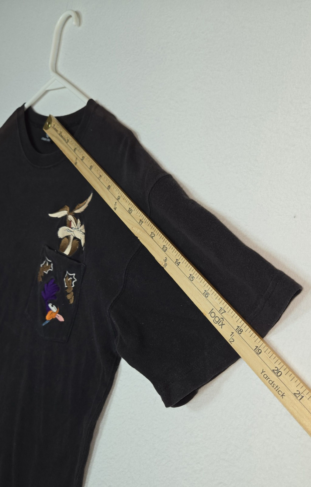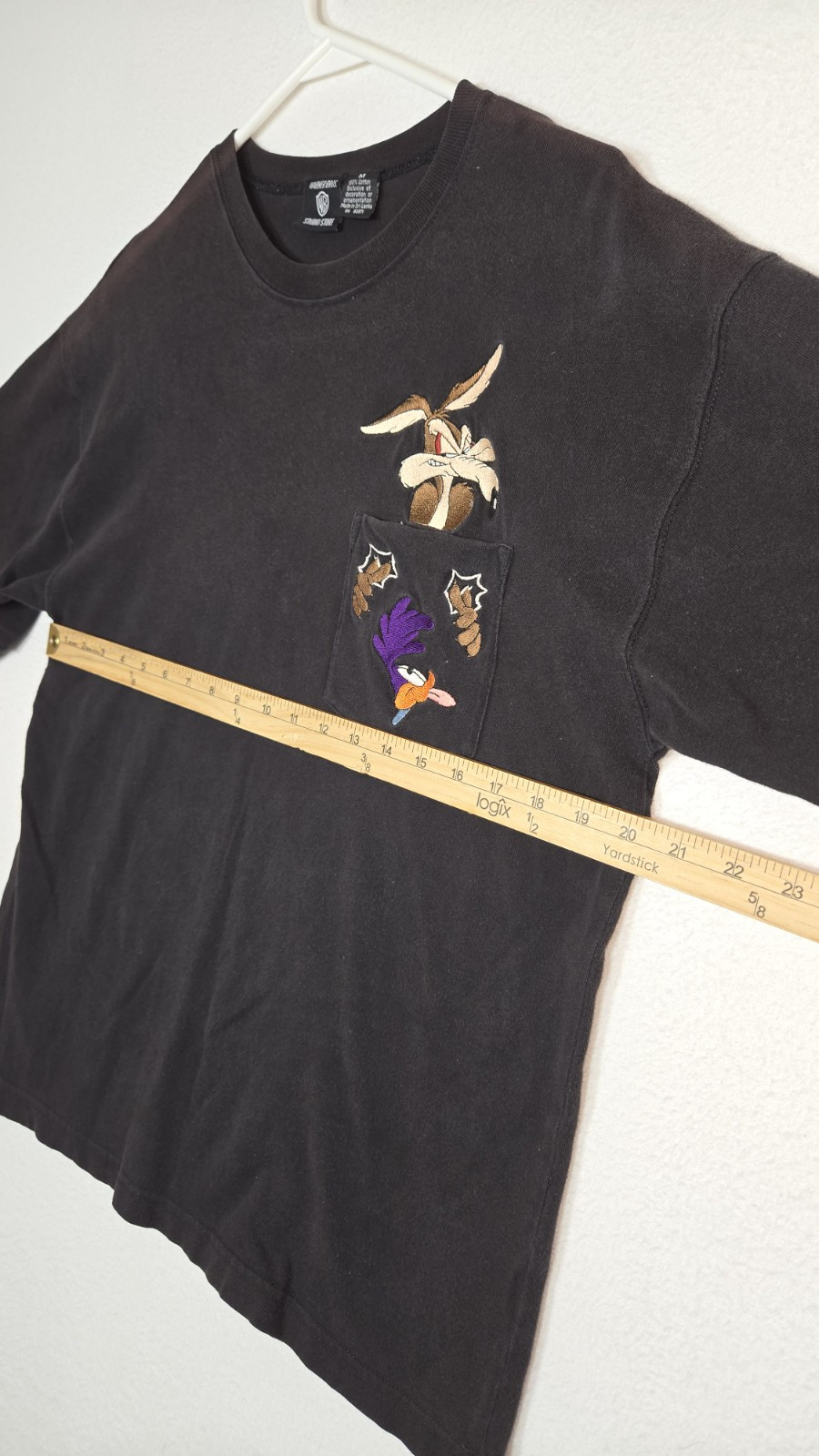 Vintage 1996 Warner Bros Studios Coyote Roadrunner Looney Tunes Tee Mens Medium Please feel free to ask any questions you may have. Thank you for looking. *** There is a slight brown discoloration on the shoulders. I have attached a photo of this. ***There is a small hole on the left backside. I have attached a photo of this as well.