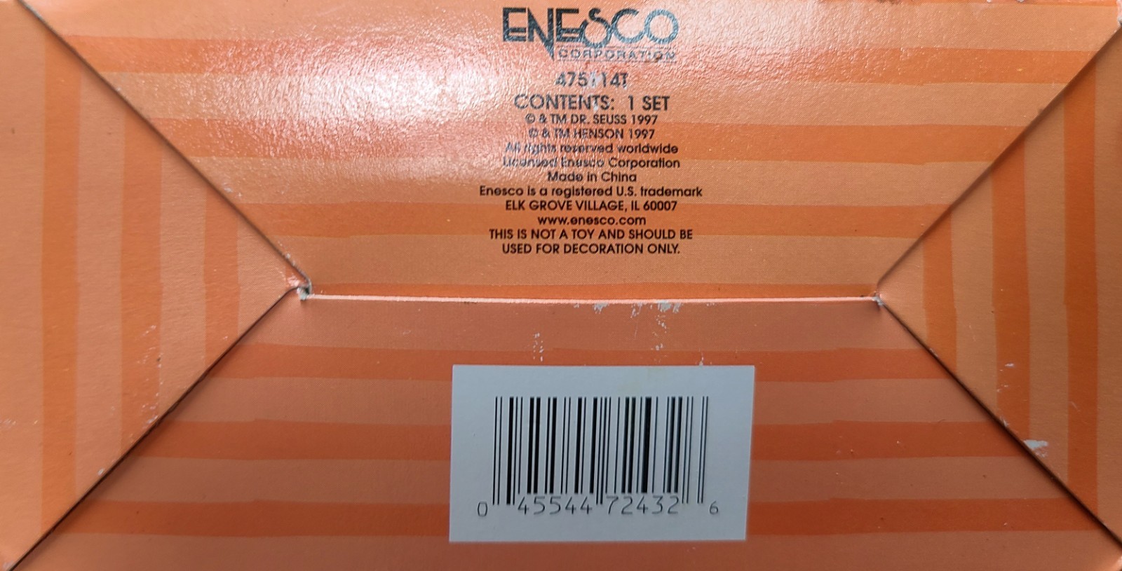 This vintage, Brand New, 1997 Dr. Seuss Horton Hears A Who Enesco ornament is a delightful addition to any holiday decor collection. The multicolored design features the beloved characters Horton and Grinch from the Dr. Seuss franchise, making it a fun and nostalgic choice for Christmas celebrations. This ornament includes a bonus mini Grinch ornament, adding to the charm and value of this collectible piece from 1997. Please see pictures and email me with questions, and thanks for looking!