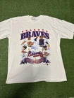 Show off your love for the Atlanta Braves with this vintage 1998 MLB T-shirt featuring Chipper Jones and Andruw Jones. Made by Joy Athletics, this white cotton crew neck T-shirt is a size XL and has a regular fit. The short sleeves and all-season features make it perfect for any fan who wants to show their support for the team. This T-shirt is easy to care for and has a classic 90s sports theme that any baseball fan will love. It's made in Mexico and has the MLB and Atlanta Braves character family. Whether you're watching a game or out and about, this T-shirt is a great way to show your team spirit. Measurements 23x30