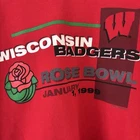 The product is a vintage 1999 Wisconsin Badgers Rose Bowl sweatshirt in size XL. This officially licensed sweatshirt is new deadstock, making it a rare and sought-after collectible for fans of the college football team. The red color and team branding make it a great addition to any fan's apparel collection, showcasing their support for the Wisconsin Badgers during the Rose Bowl game. This piece is a must-have for collectors of vintage sports memorabilia and fans of the team looking to commemorate a historic moment in their team's history.