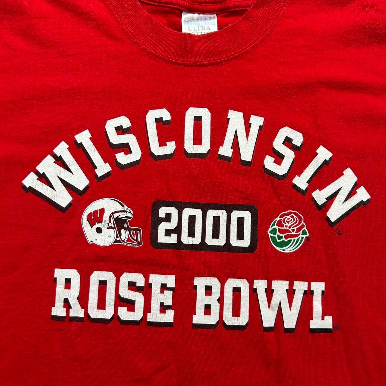 length - 28" pit to pit - 21" size - large excellent condition no flaws This vintage 2000 Wisconsin Rose Bowl football men's large tee is a red short sleeve T-shirt made of cotton with a crew neck neckline. Designed by Gildan, it features a classic Gildan Ultra Cotton product line and is perfect for fans of the Wisconsin football team. The shirt commemorates the team's appearance in the Rose Bowl in the year 2000, making it a nostalgic and unique addition to any fan's wardrobe.