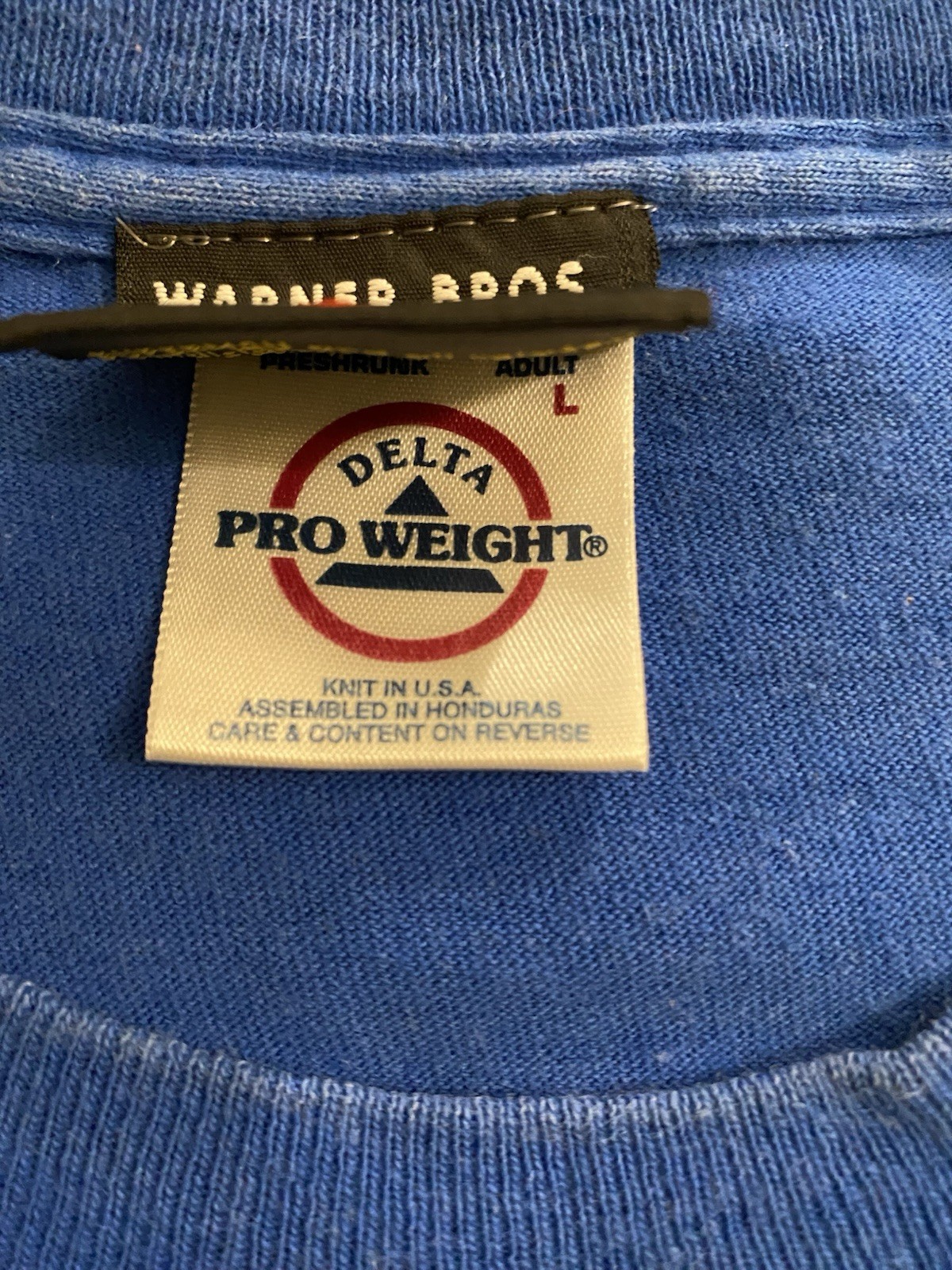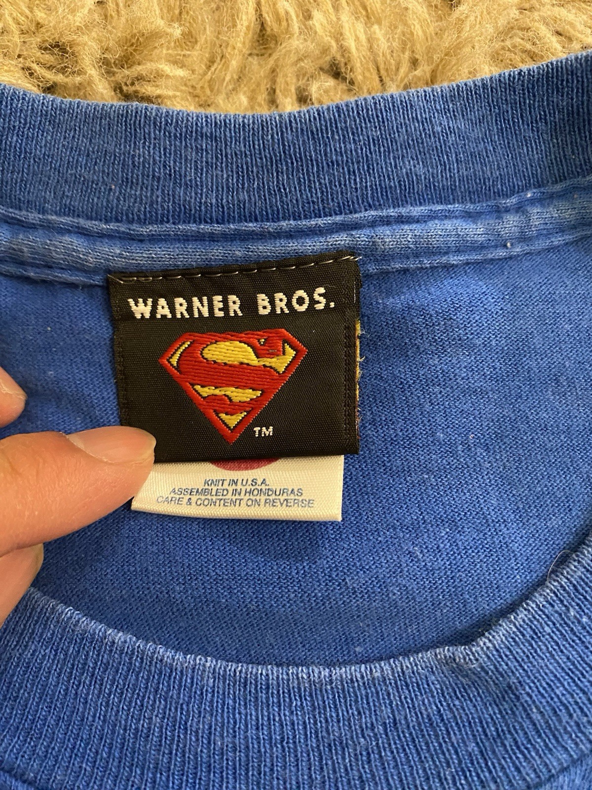 This vintage 2001 Warner Bros Red White & Blue Superman Men's Navy Shirt features a classic Superman character design in blue, accented with patriotic graphics. Made from cotton fabric, this short sleeve T-shirt has a crew neckline and a regular fit. Perfect for any Superman fan or lover of patriotic-themed apparel, this shirt is a timeless piece that celebrates the iconic Superman character. Made in the United States with assembled parts in Mexico, this shirt is a must-have for any collector or enthusiast of vintage clothing.