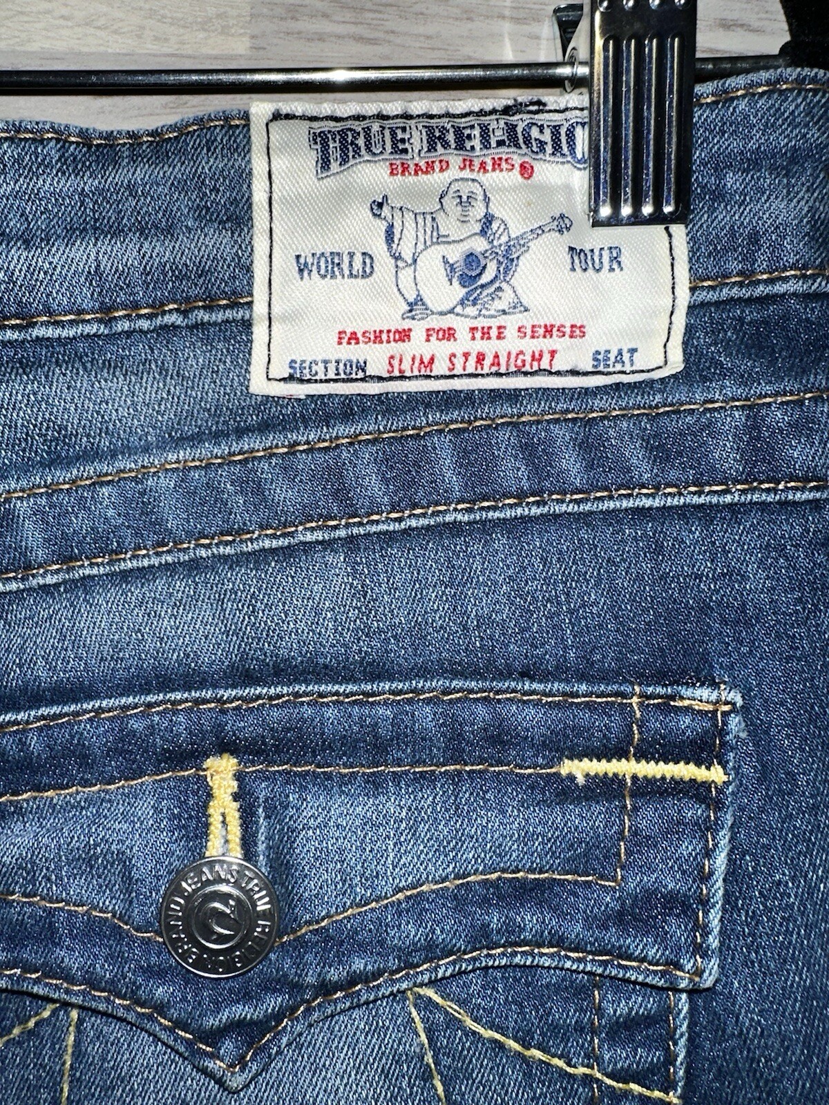 This pair of vintage True Religion jeans is a must-have for any fashion-forward man. The medium wash denim with a solid pattern and button closure is perfect for any season, be it winter, summer, fall, or spring. Made of high-quality cotton with a denim fabric type, these jeans are both comfortable and durable. Featuring a slim straight fit and a 32-inch waist size, these jeans are designed to flatter your figure. The zipper accents, preppy logo theme, and slimming features make these jeans the perfect addition to your wardrobe. Made in the United States in 2003, these jeans are a rare find that will surely turn heads.