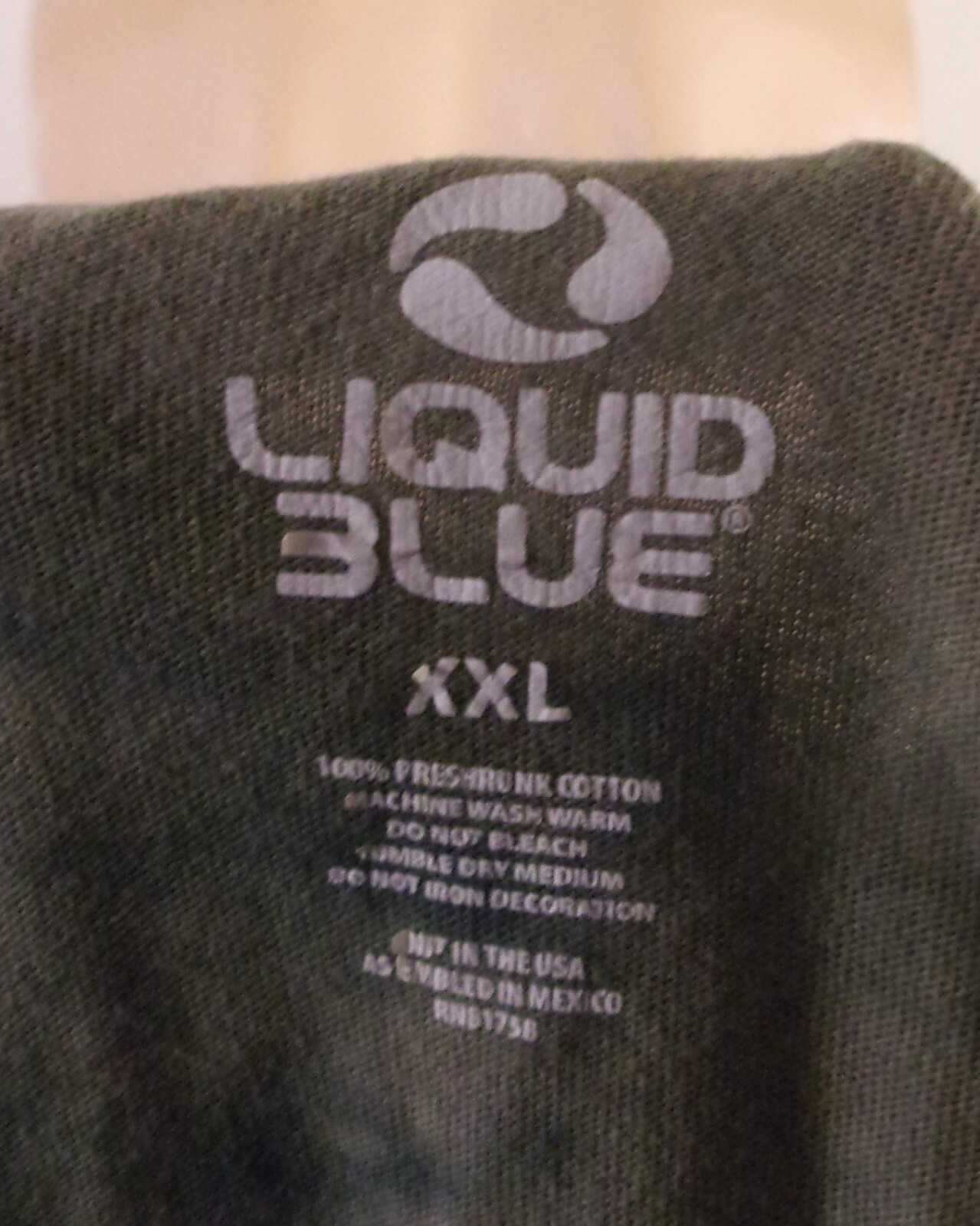 This vintage Liquid Blue T-shirt features a tie-dye design in multicolor, with a KISS band concert tour theme. It is a size XXL, made of cotton material with a crew neck and short sleeves. The shirt has a rock and music band theme, making it a stylish choice for any season. Looks awesome - great shape throughout with no holes or stains.
