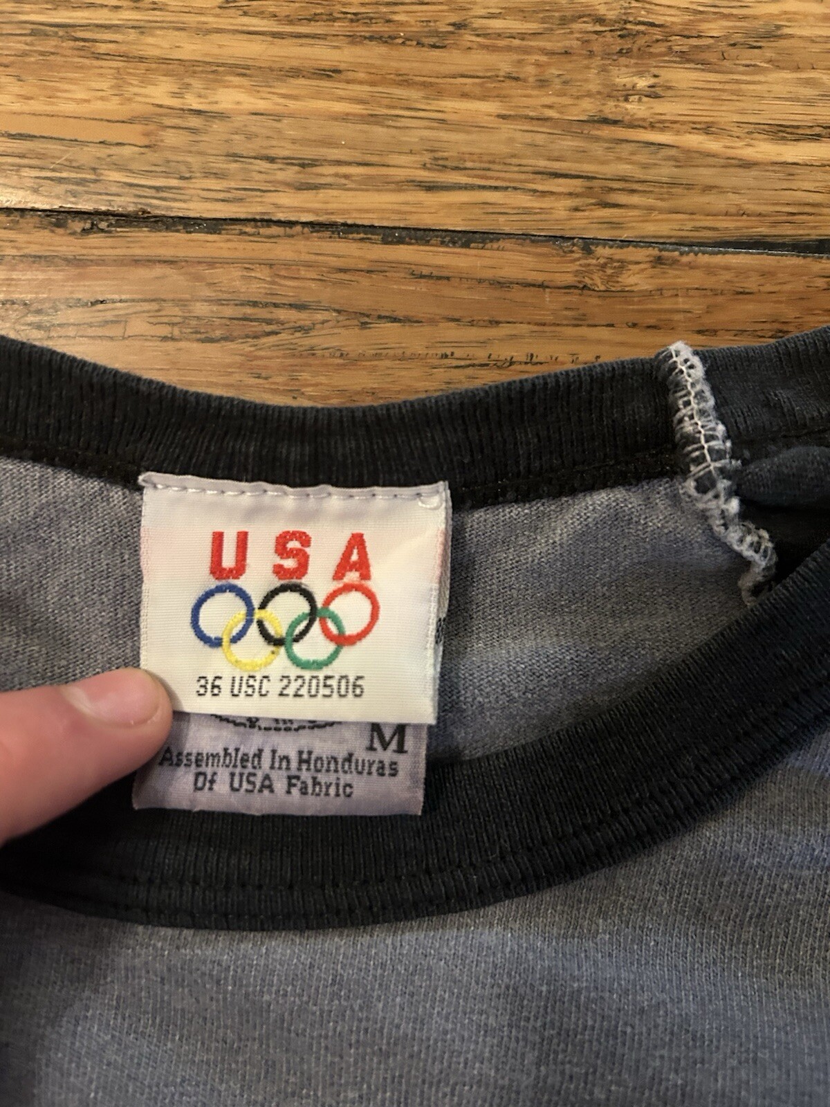 This Vintage Torino 2008 Olympics Tee is a solid blue t-shirt with a crew neck and short sleeves, made of cotton material. It has a regular fit in size M for men, bearing the vintage olympic branding. This classic piece is suitable for all seasons, capturing the essence of the 2008 Olympics in Torino.