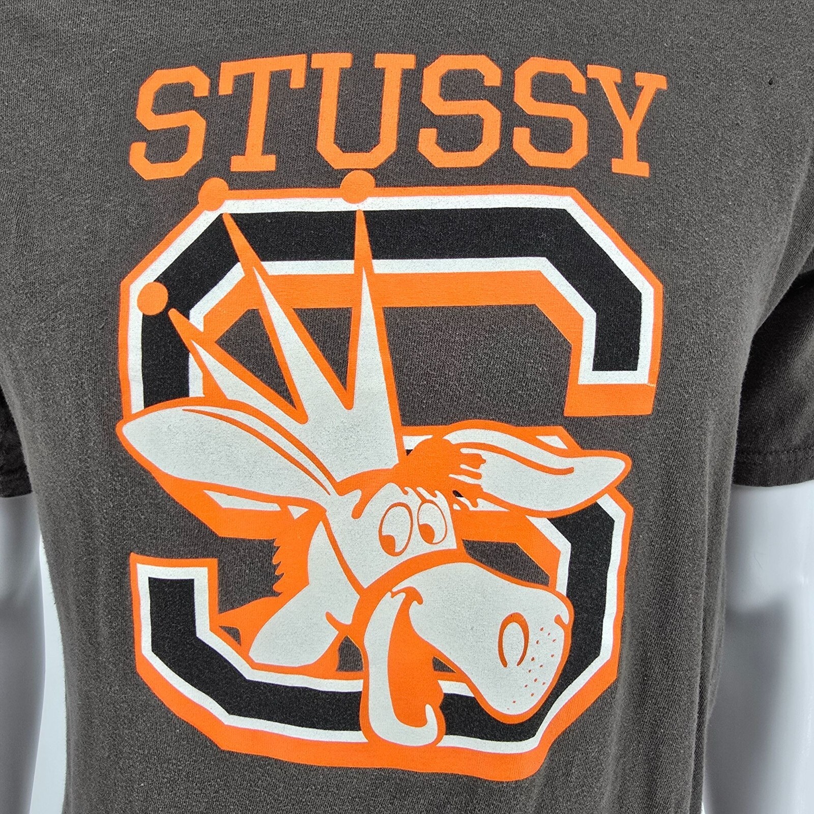 🔹 Item Details: Brand: Stüssy Material: 100% Cotton Color: Gray Decade of Manufacture: 2010s Country of Manufacture: Mexico Notable Features: Features a bold front graphic with "Stüssy" lettering, varsity-style "S" logo, and a cartoon donkey wearing a crown. 🔹 Condition Notes: Fair/distressed used vintage condition. Pinholes at both shoulders on front. Pinhole on back left shoulder. A few other pinholes scattered throughout. Moderate fabric wear throughout. Moderate to heavy fading throughout. See photos. 🔹 Size Notes: Tag Size: Medium Measured Size: Medium 🔹 Measurements (Approximate): Chest (pit to pit): 38 inches Length (collar to hem): 26 inches 🔹 Shipping & Returns: Ships worldwide from Lexington, KY Ships within 3 business days of purchase Returns accepted within 60 days for domestic orders and 30 days for international orders 🔹 Research Notes: I have seen shirts with this exact design and tag called vintage 90s or Y2K. However, my research dates this shirt to the 2010s (likely the early 2000s).