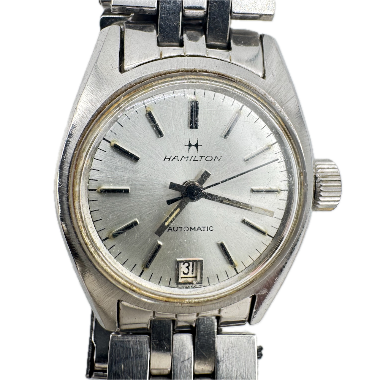 Vintage 21mm Hamilton 695003-3 17 Jewel Ladies Automatic Wristwatch 695 Swiss Product Description Item: Wristwatch Brand: Hamilton Model: Date Reference: 695003-3 Movement: Automatic Case Material: Stainless Steel Country: Swiss Jewels: 17 Jewel Gender: Ladies Caliber: 695 Size: 21mm Product Measurements Diameter: 21mm Length: 6mm Lug Width: 13mm Lug to Lug: 27.5mm Thickness: 9.5 mm Bracelet Size: 6 in Product Condition Overall Condition: Good, overall condition for its age. Functions: Not running, has been tested and is not running. Case: There are scratches on the case. Crystal: There is discoloration on the crystal. Dial: The dial is in good condition. About the brand: Producing their first pocket watches in Lancaster, PA as early as 1892, Hamilton watches are one of the most recognizable American watch brands. While they moved production of their watches to Switzerland in 1969, the American catalog of Hamilton watches is impressive. Recognizable models such as the Ventura, worn by Elvis Presley, and their WW2 military issue “Khaki” watches, Hamilton still enjoys a large presence in the market today. Offering both well made modern pieces and a backlog of wonderful vintage items - Hamilton offers much for the vintage and modern collector.