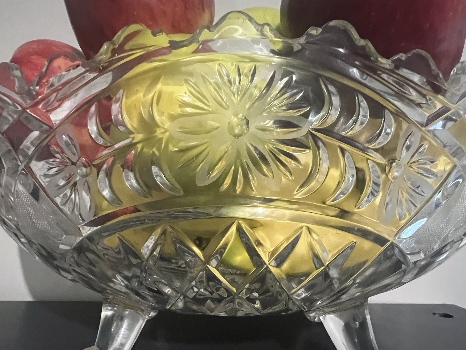 This is a gorgeous W. German Anna Hutte Belk tall 24% Lead Crystal hand-cut footed bowl. The oval shape and clear color make it a stunning addition to any décor. The bowl measures 5.50 inches in height, 11.25 inches in width, and 7 inches in depth. It is made of high-quality crystal material, making it a durable and elegant choice for any occasion. Perfect for displaying as a decorative piece or using as a serving bowl for guests. Or fruit bowl. Fruit not included.