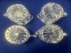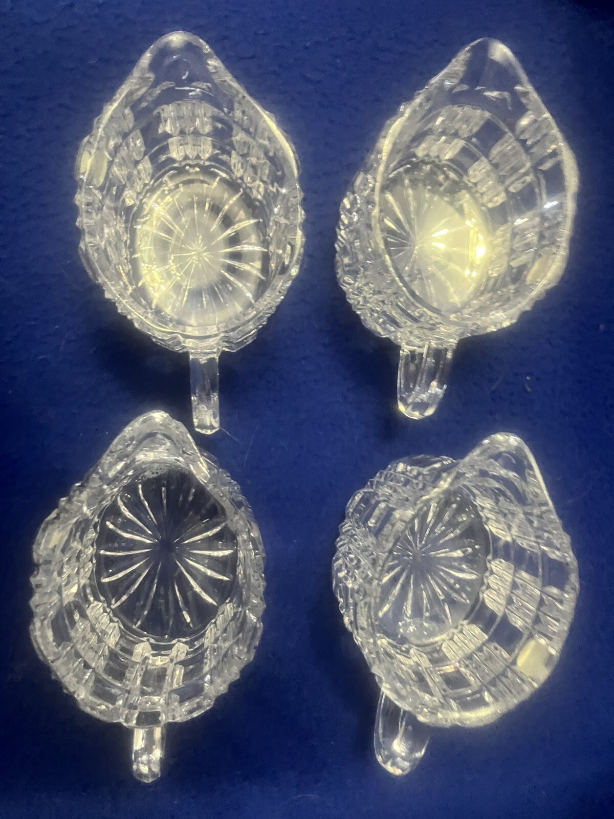 Presenting timeless pieces of elegance: four vintage 24% Lead Crystal Mid Century Modern Creamers, unmarked, featuring a refined oval shape and adorned with a delicate block pattern. Each piece has a gold sticker marked 24% PbO. Each approximately 3.5” in height and 3” long. Use as creamers at individual place settings or to hold cotton or q-tips on vanity or dresser! The sparkle created when light shines through this crystal is just stunning! Perfect for adding a touch of vintage charm to your table or home!