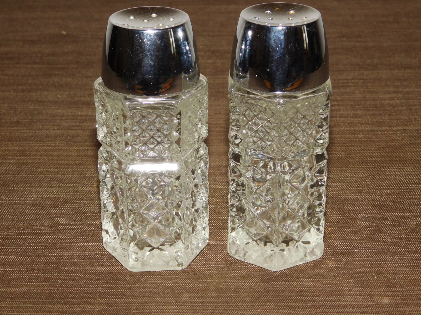 YOU ARE BIDDING ON...... VINTAGE 4 1/4" HIGH GLASS USA SALT & PEPPER SHAKERS NEW OLD STOCK ..... .SOME AGE DISCOLORATION ON METAL TOPS.... .PLEASE VIEW PHOTOS FOR CONDITION.***PLEASE E-MAIL IF YOU HAVE A QUESTION OR WANT AN ADDITIONAL PICTURE....PLEASE VISIT MY EBAY STORE FOR ADDITIONAL VINTAGE ITEMS..THANK YOU**11T-BX0600-XXXX