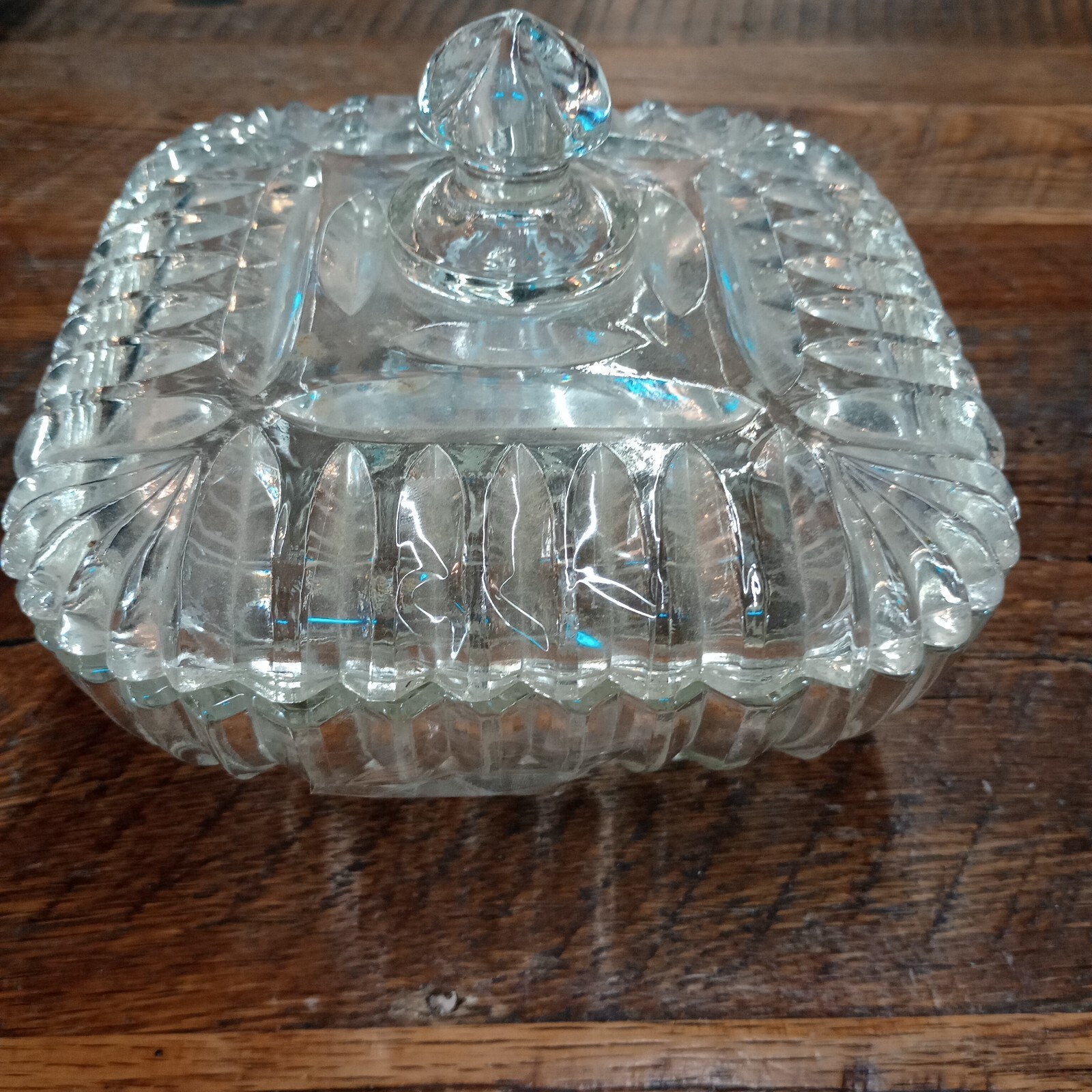 This vintage Anchor Hocking square clear glass candy dish with deep cuts is a charming addition to any home decor. The 6.5" bowl features a retro pattern and is made of sturdy glass, perfect for storing and showcasing sweets. The set includes a lid and is part of the Anchor Hocking product line, known for its quality craftsmanship. Ideal for collectors or those looking to add a touch of nostalgia to their kitchen or dining room. Measures 6.5" wide and 5" tall
