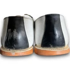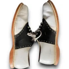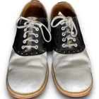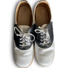 Vintage 50s 60s Barefoot genuine saddle Oxford shoes black white split leather lining, fiber insole lace up closure on round toe shoes. The shoes have light scuffs and scratches (please review photos) although in great shape for their age. The insoles will need to be replaced. Listed size women’s 8 although please refer to the measurements below for sizing: Length 10.5” Width toe box 3.5” Width heel 3”