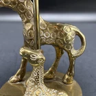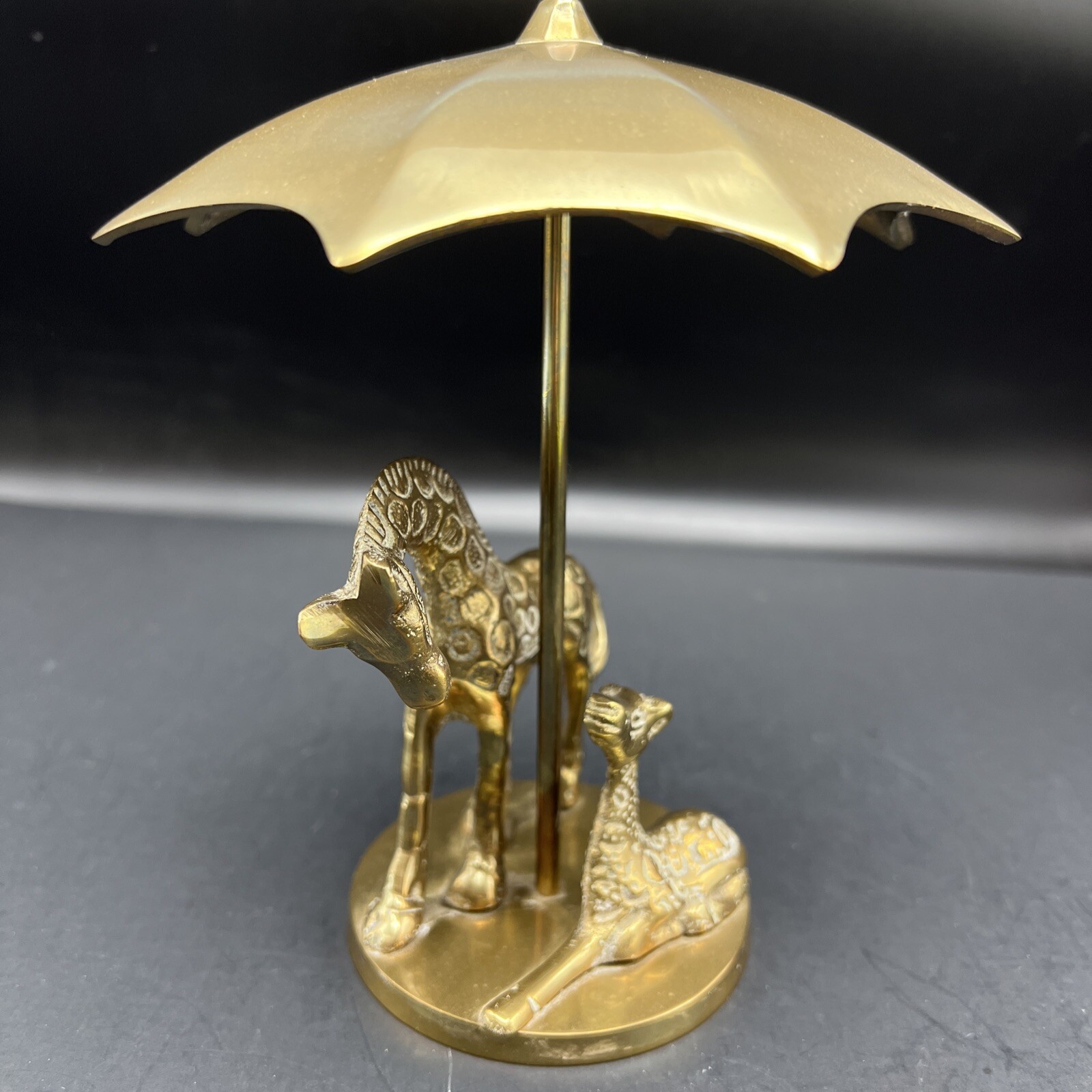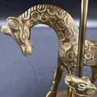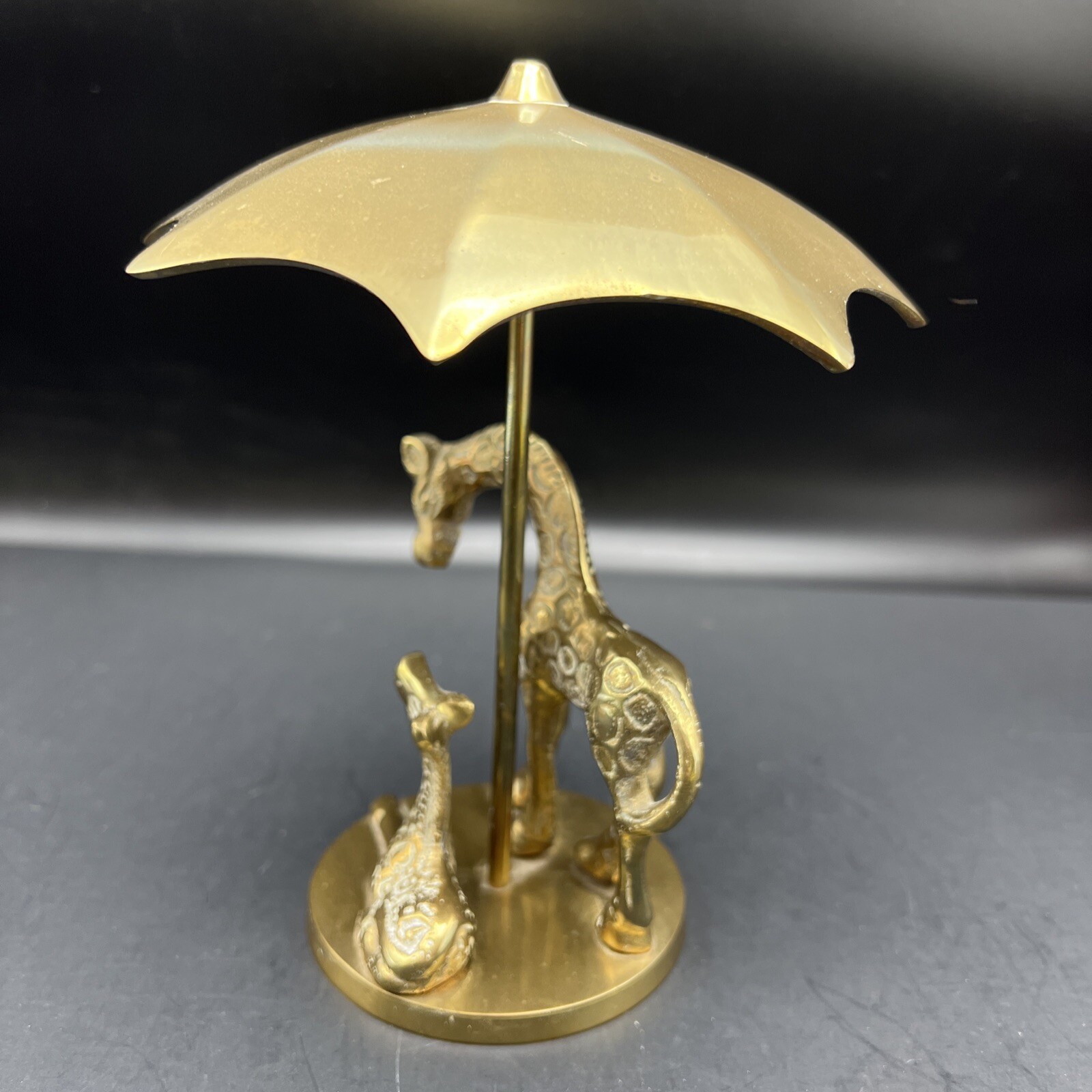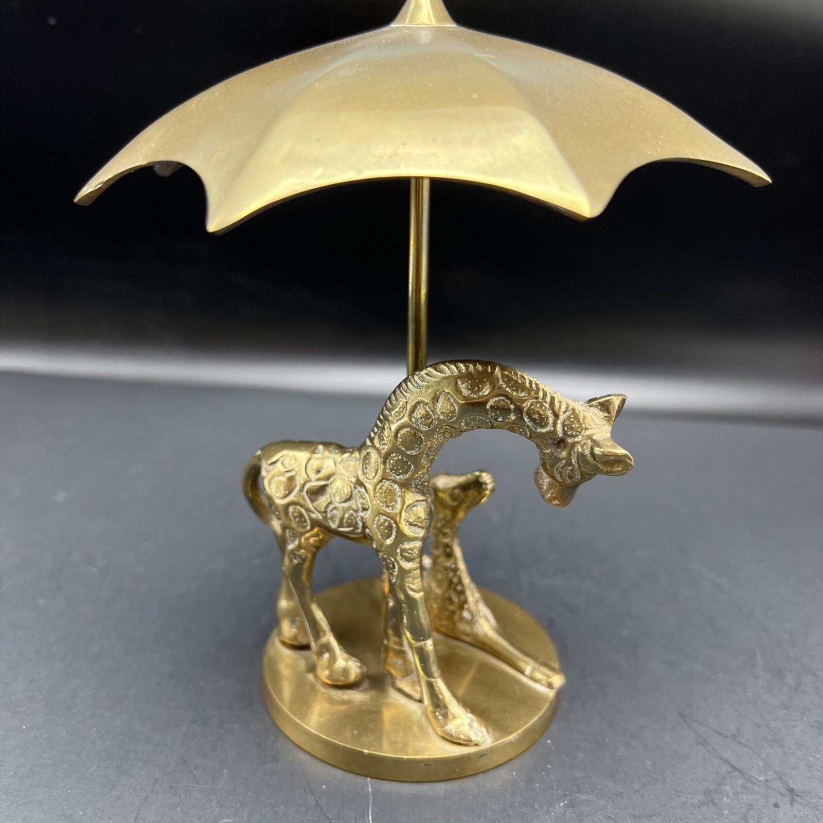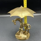 This antique brass Giraffe Figurine from India depicts a mother and baby giraffe taking shelter under an umbrella. The intricate details and intricate workmanship make this metalware collectible a valuable addition to any collection. The brass material used to create this figurine ensures durability and longevity. This vintage piece stands at 6 inches tall and is a must-have for animal figurine enthusiasts. The Giraffe and baby figurine were crafted with precision and attention to detail. The metalware collectible is not only aesthetically pleasing but is also a perfect addition to any home decor. I will pack with care and get it to you ASAP Thank you for looking !