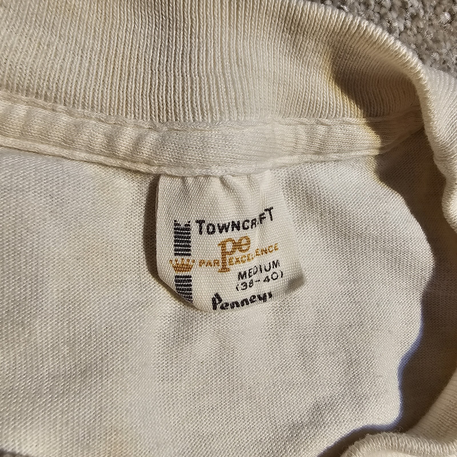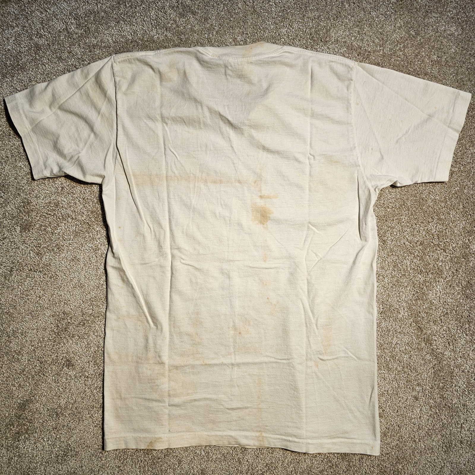 Split neck, stains throughout, other flaws, pictured. Otherwise good condition, laundered. Tagged size Medium, pit to pit 18", shoulder to hem 25". Ships USPS Ground Advantage.