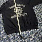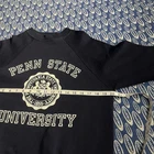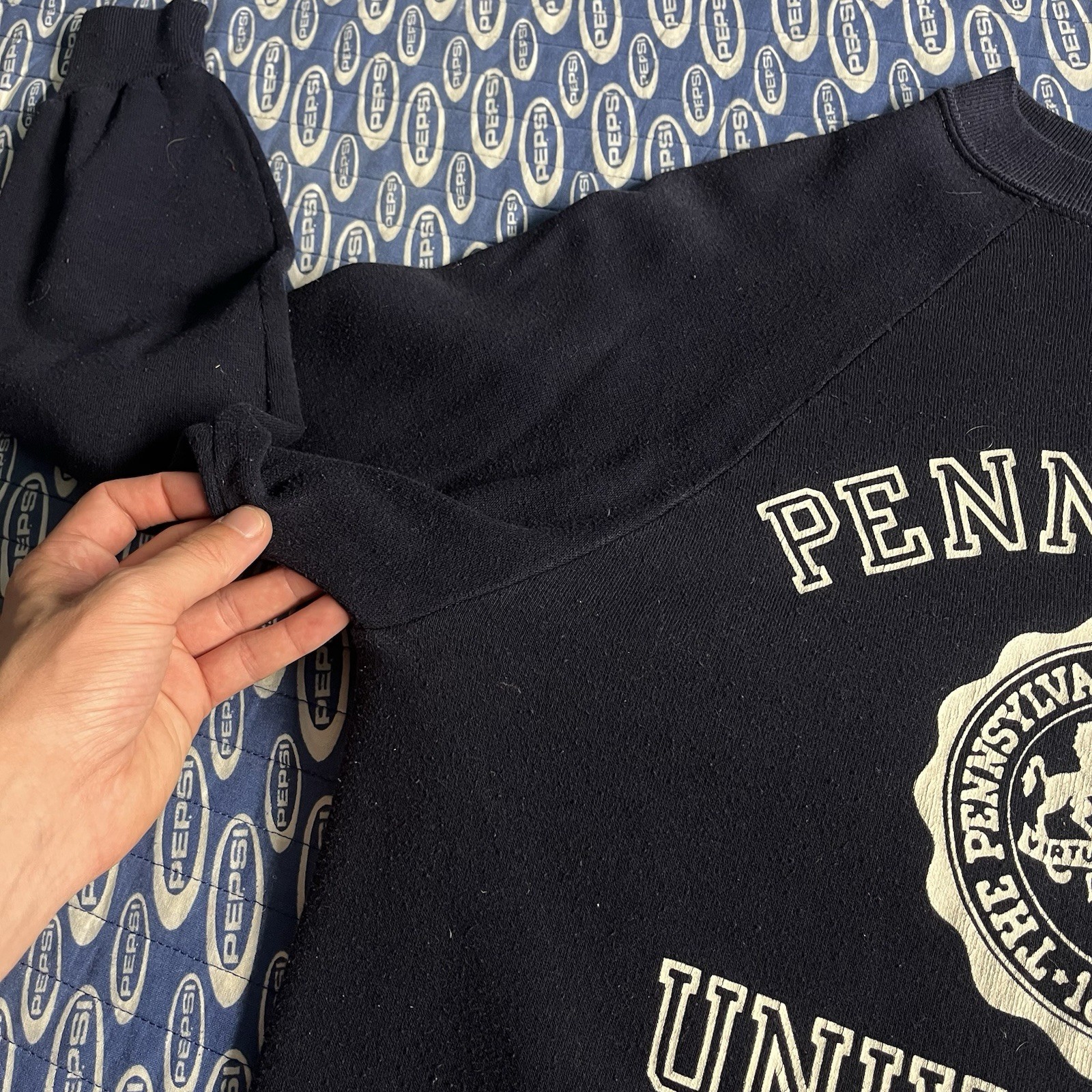 The product is a vintage 60s Penn State University flock print raglan sweatshirt in navy blue, size M. This collectible apparel features the Penn State brand, making it a sought-after item for fans of the team. The retro design and classic colors add a nostalgic touch to this piece of sports memorabilia, perfect for showing support for the Penn State University football team.