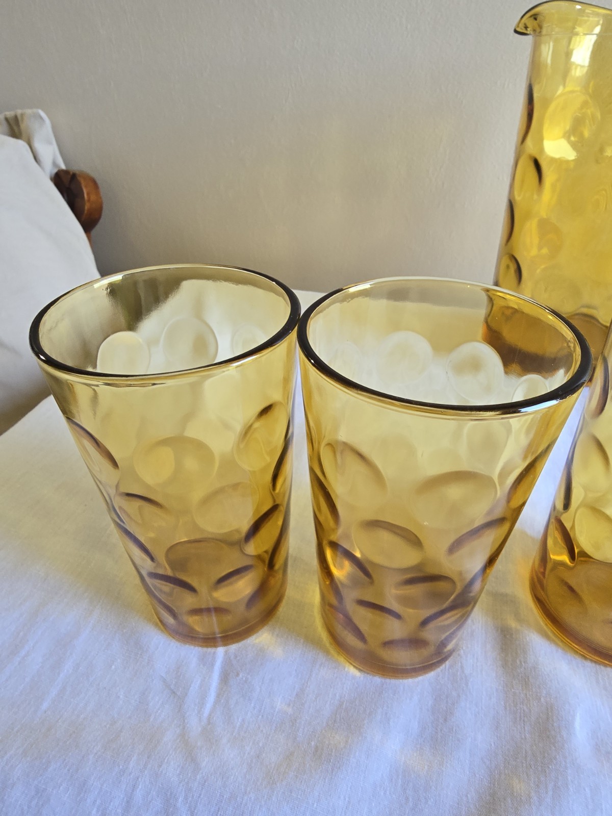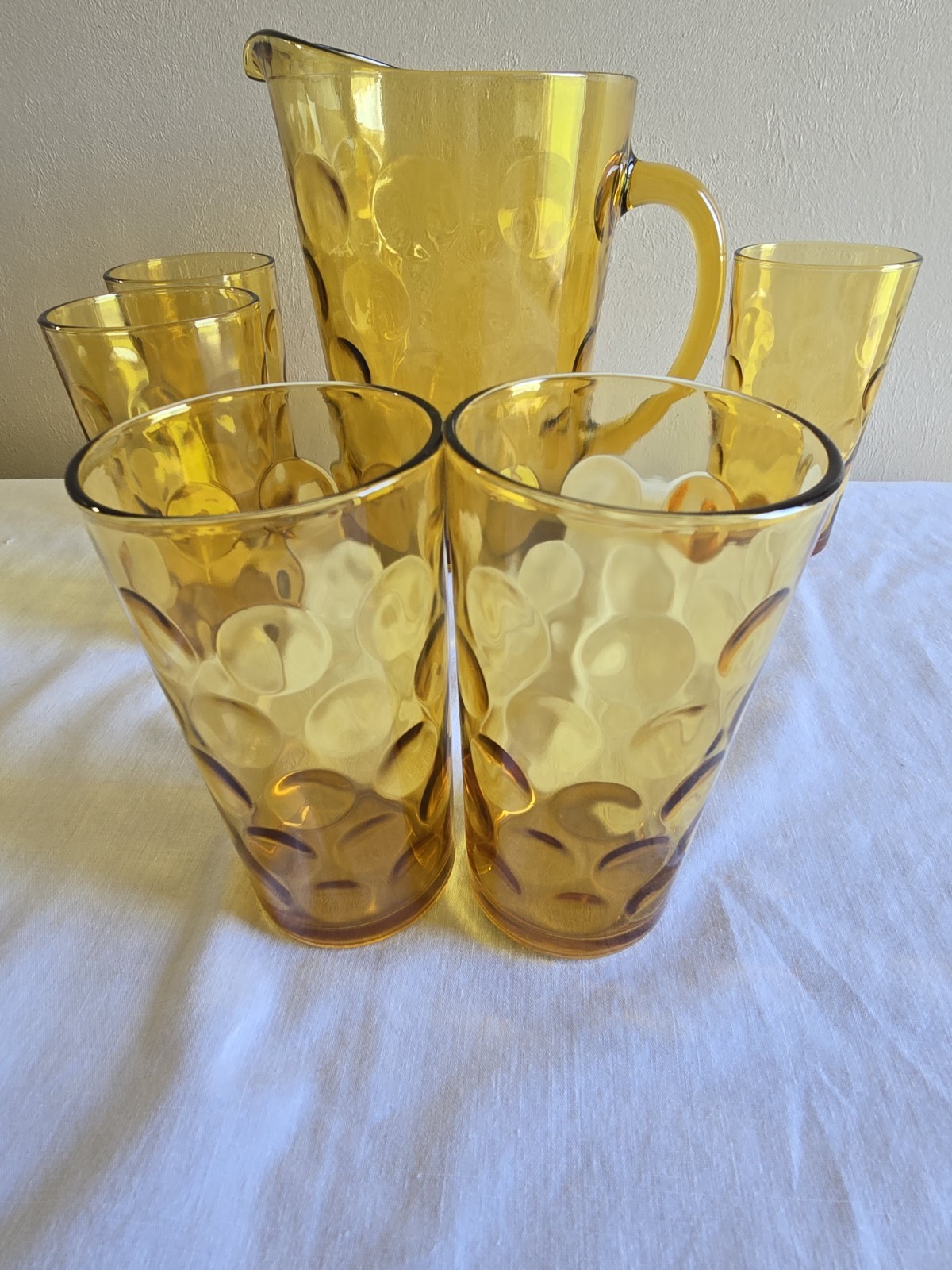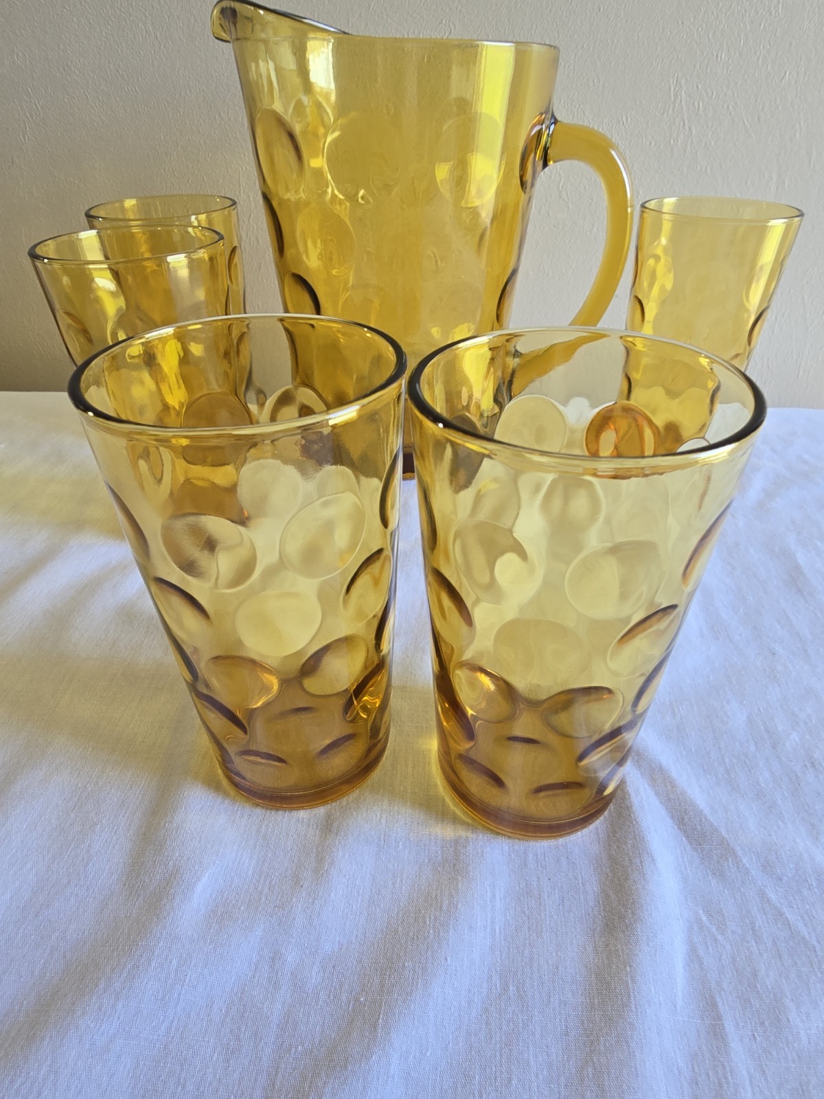They have scratches. Pitcher 8 x 6 in Glases 2-3/4 x 5-1/4 in